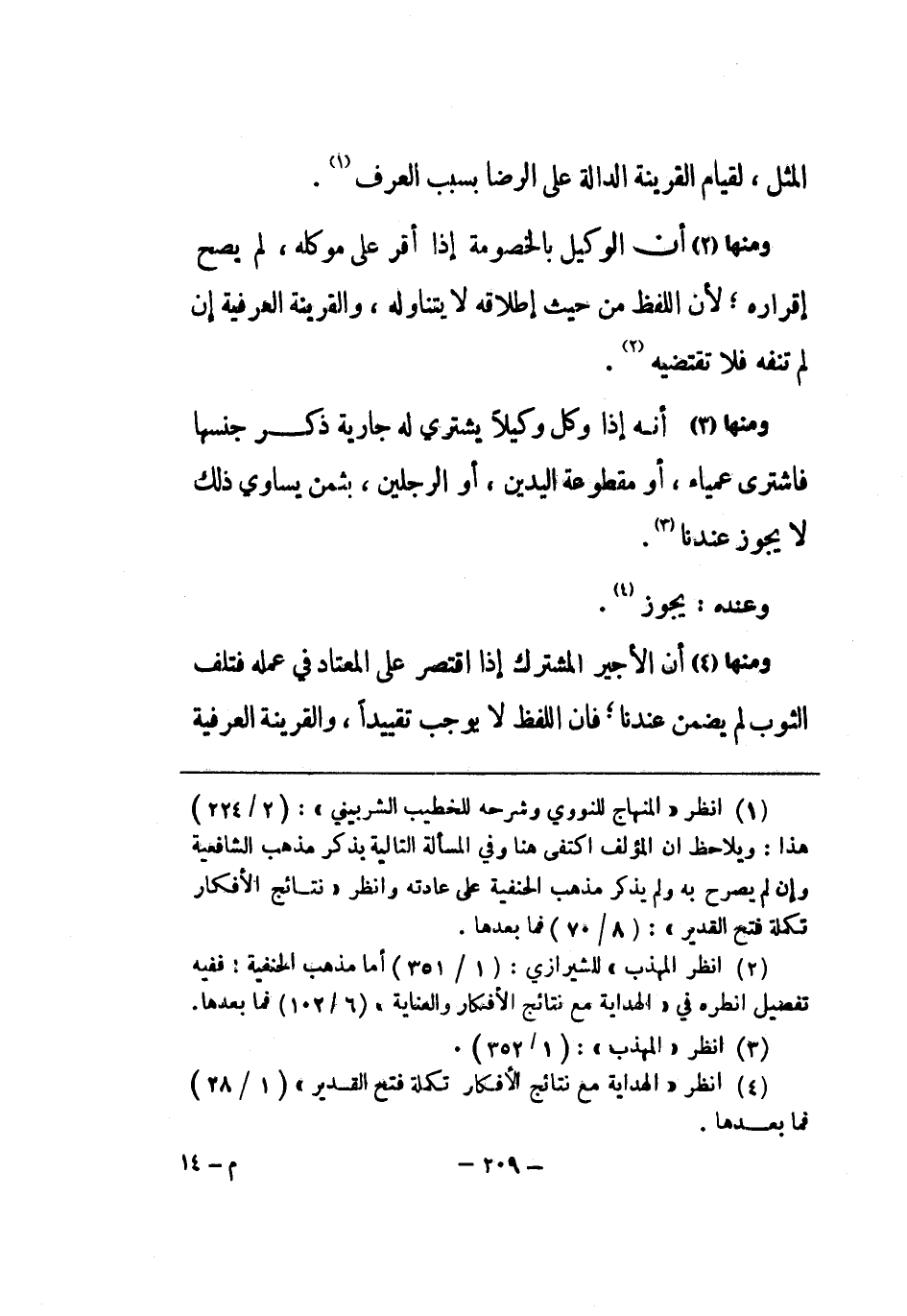 وَمِنْهَا أَن الْأَجِير الْمُشْتَرك إِذا أقتصر على الْمُعْتَاد فِي عمله فَتلف الثَّوْب لم يضمن عندنَا فان اللَّفْظ لَا يُوجب تقييدا والقرينة الْعُرْفِيَّة
