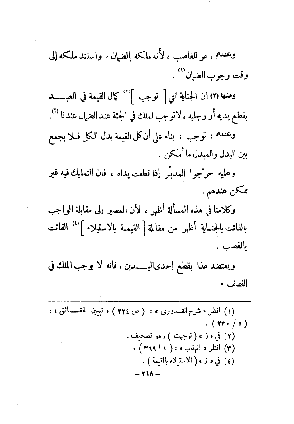 وكلامنا فِي هَذِه الْمَسْأَلَة أظهر لِأَن الْمصير إِلَى مُقَابلَة الْوَاجِب بالفائت بِالْجِنَايَةِ أظهر من مُقَابلَة الْقيمَة بِالِاسْتِيلَاءِ الْفَائِت بِالْغَصْبِ ويعتضد هَذَا بِقطع إِحْدَى الْيَدَيْنِ فانه لايوجب الْملك فِي النّصْف