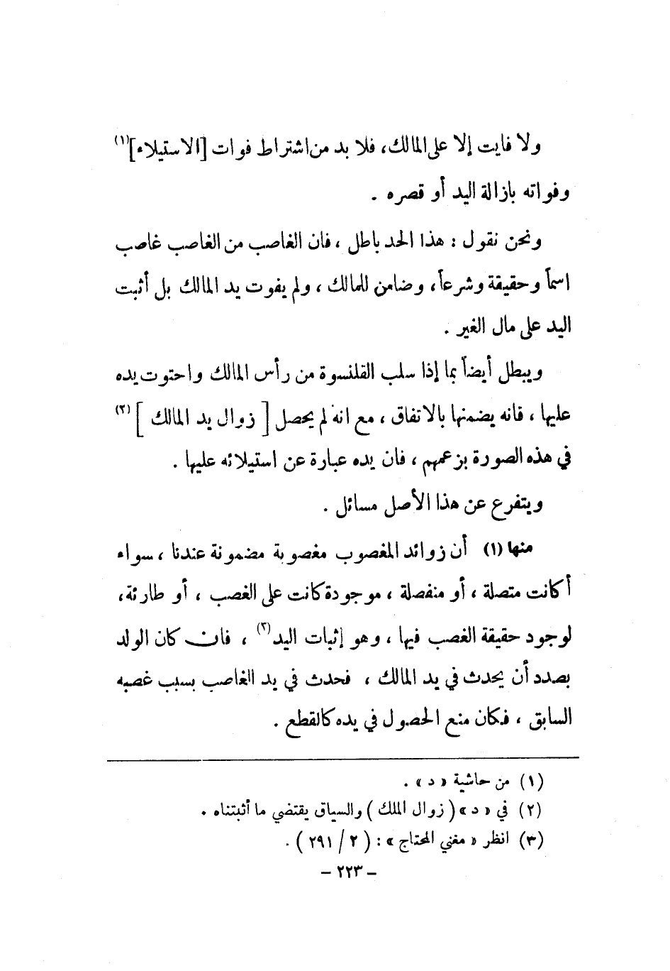 مِنْهَا أَن زَوَائِد الْمَغْصُوب مَغْصُوبَة مَضْمُونَة عندنَا سَوَاء أَكَانَت مُتَّصِلَة أَو مُنْفَصِلَة مَوْجُودَة كَانَت على الْغَصْب أَو طارئة لوُجُود حَقِيقَة الْغَصْب فِيهَا وَهُوَ إِثْبَات الْيَد فان كَانَ الْوَلَد بصدد أَن يحدث فِي يَد الْمَالِك فَحدث فِي يَد الْغَاصِب بِسَبَب غصبه السَّابِق فَكَانَ منع الْحُصُول فِي يَده كالقطع