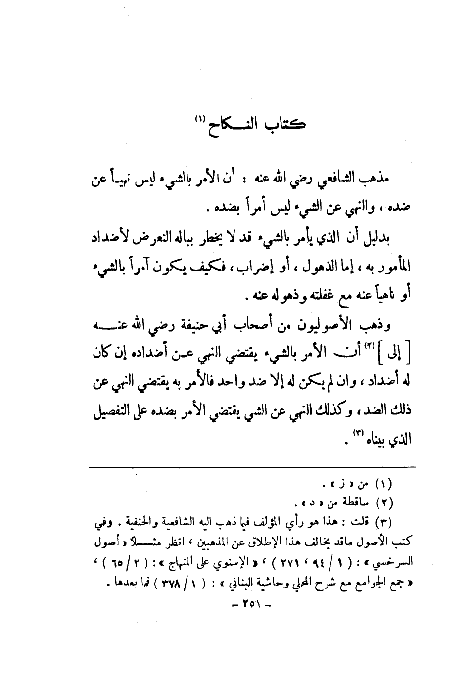 وَذهب الأصوليون من أَصْحَاب أبي حنيفَة رض إِلَى أَن الْأَمر بالشَّيْء يَقْتَضِي النَّهْي عَن أضداده إِن كَانَ لَهُ أضداد وَإِن لم يكن لَهُ إِلَّا ضد وَاحِد فَالْأَمْر بِهِ يَقْتَضِي النَّهْي عَن ذَلِك الضِّدّ وَكَذَلِكَ النَّهْي عَن الشَّيْء يَقْتَضِي الْأَمر بضده على التَّفْصِيل الَّذِي بَيناهُ