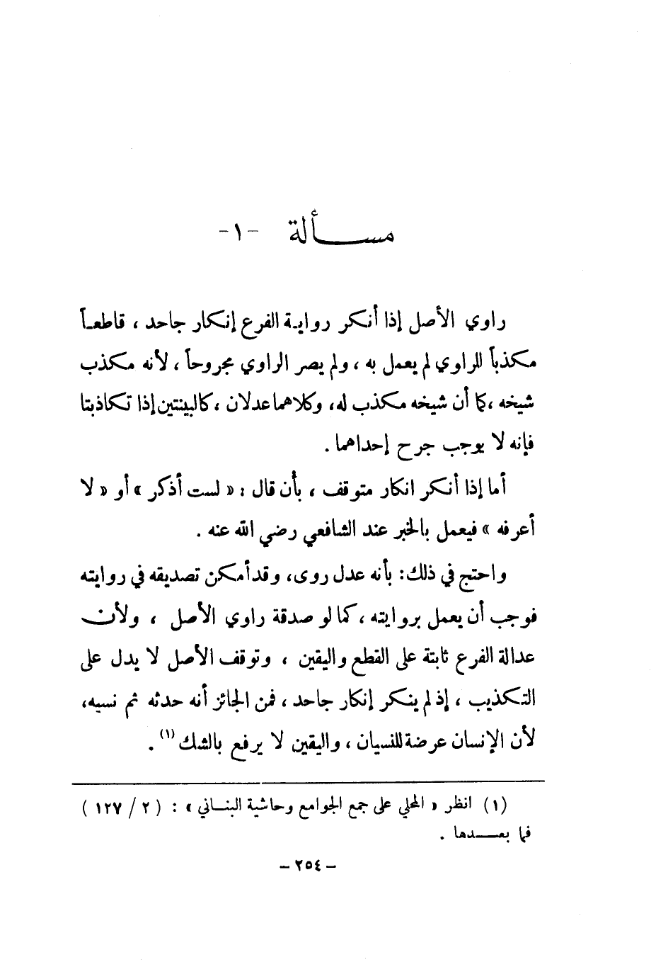 رَاوِي الأَصْل إِذا أنكر رِوَايَة الْفَرْع إِنْكَار جَاحد قَاطعا مُكَذبا للراوي لم يعْمل بِهِ وَلم يصر الرَّاوِي مجروحا لِأَنَّهُ مكذب شَيْخه كَمَا أَن شَيْخه مكذب لَهُ وَكِلَاهُمَا عَدْلَانِ كالبينتين إِذا تكاذبتا فَإِنَّهُ لايوجب جرح أَحدهمَا