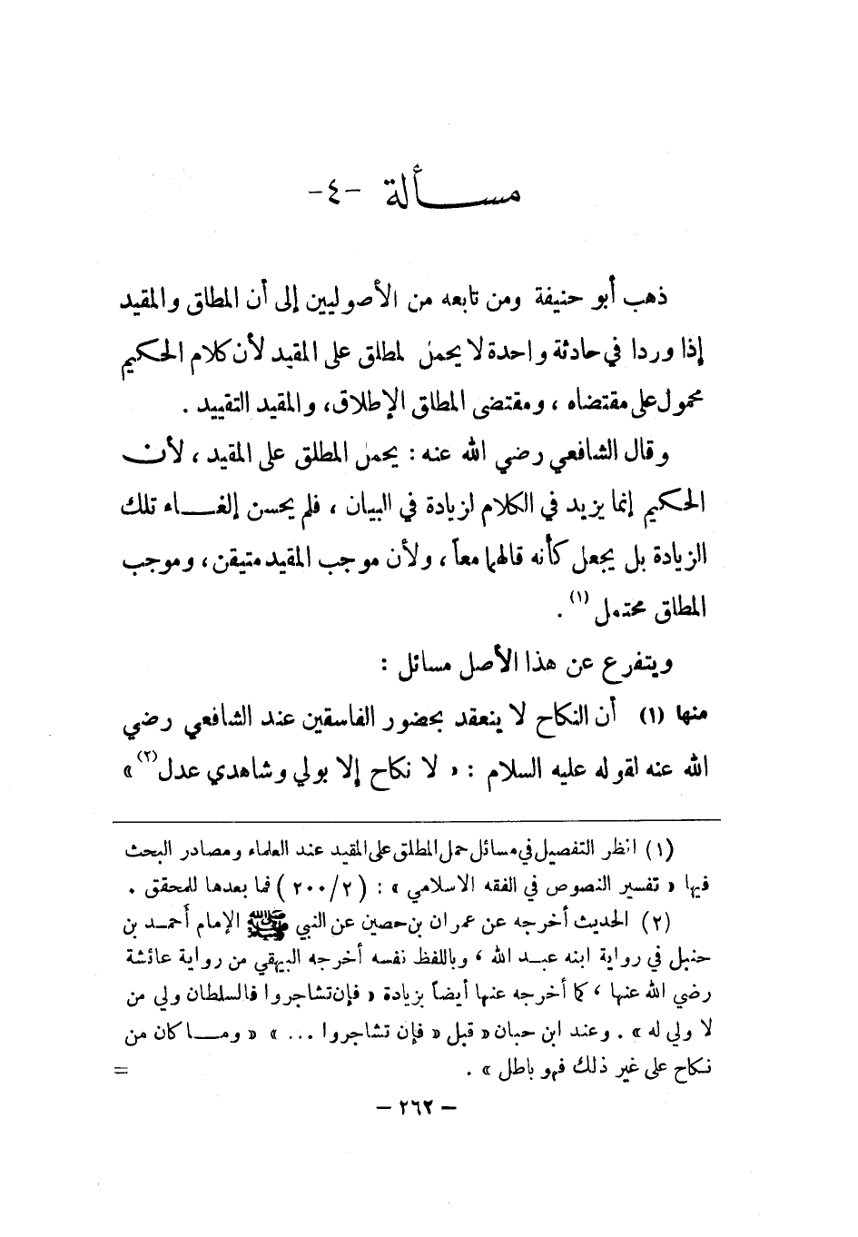 وَيتَفَرَّع عَن هَذَا الأَصْل مسَائِل مِنْهَا أَن النِّكَاح لَا ينْعَقد بِحُضُور الْفَاسِقين عِنْد الشَّافِعِي رض لقَوْله عَلَيْهِ السَّلَام لَا نِكَاح إِلَّا بولِي وشاهدي عدل