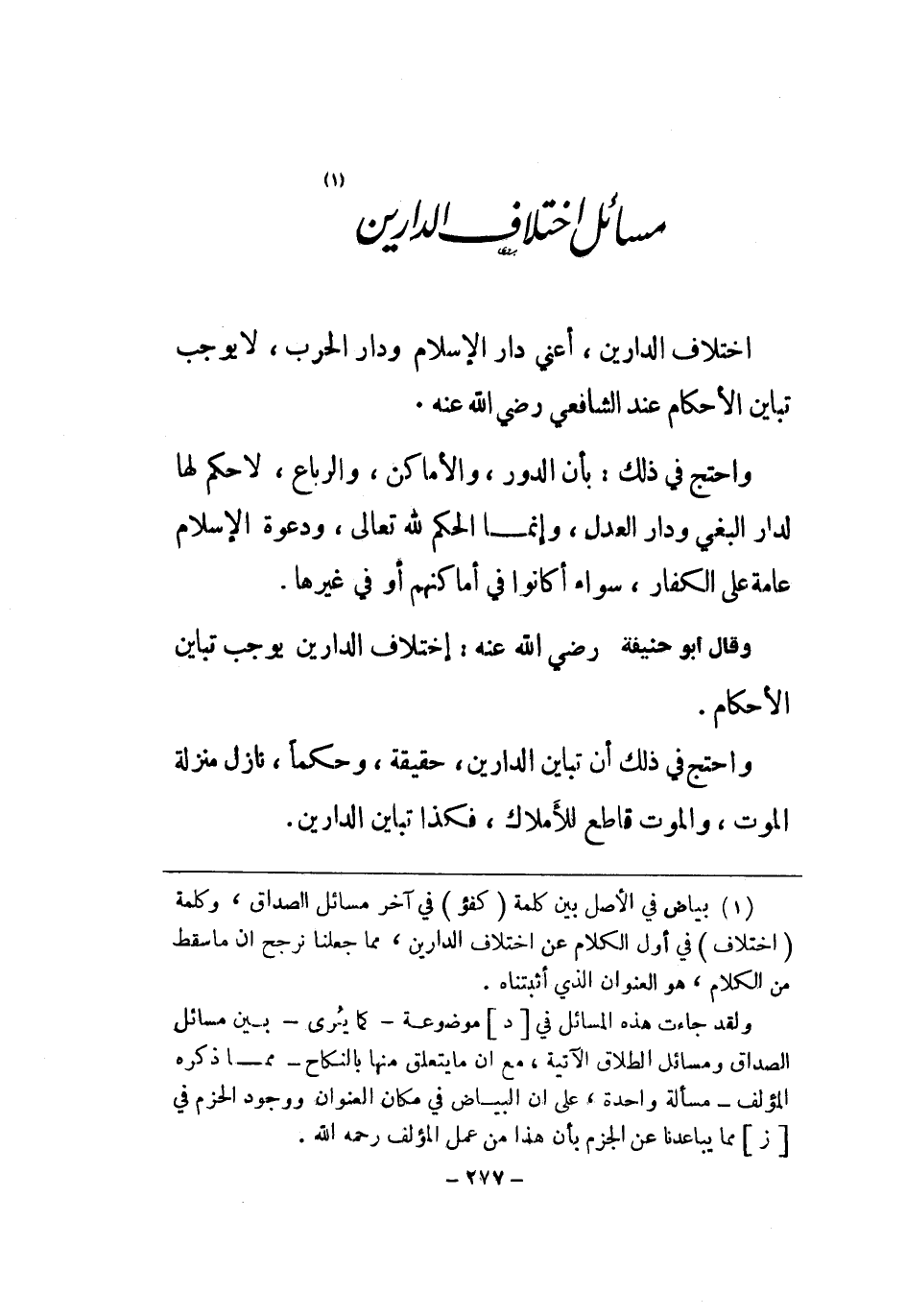 اخْتِلَاف الدَّاريْنِ أَعنِي دَار الْإِسْلَام وَدَار الْحَرْب لَا يُوجب تبَاين الْأَحْكَام عِنْد الشَّافِعِي رض