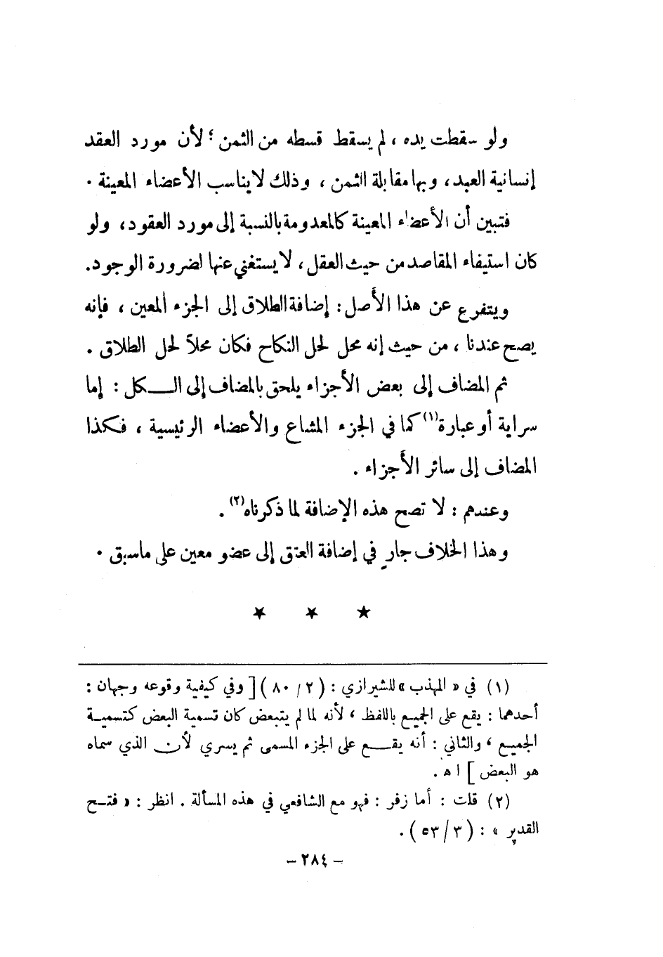 ثمَّ الْمُضَاف إِلَى بعض الْأَجْزَاء يلْحق بالمضاف إِلَى الْكل إِمَّا سرَايَة أَو عبارَة كَمَا فِي الْجُزْء الْمشَاع والأعضاء الرئيسية فَكَذَا الْمُضَاف إِلَى سَائِر الْأَجْزَاء