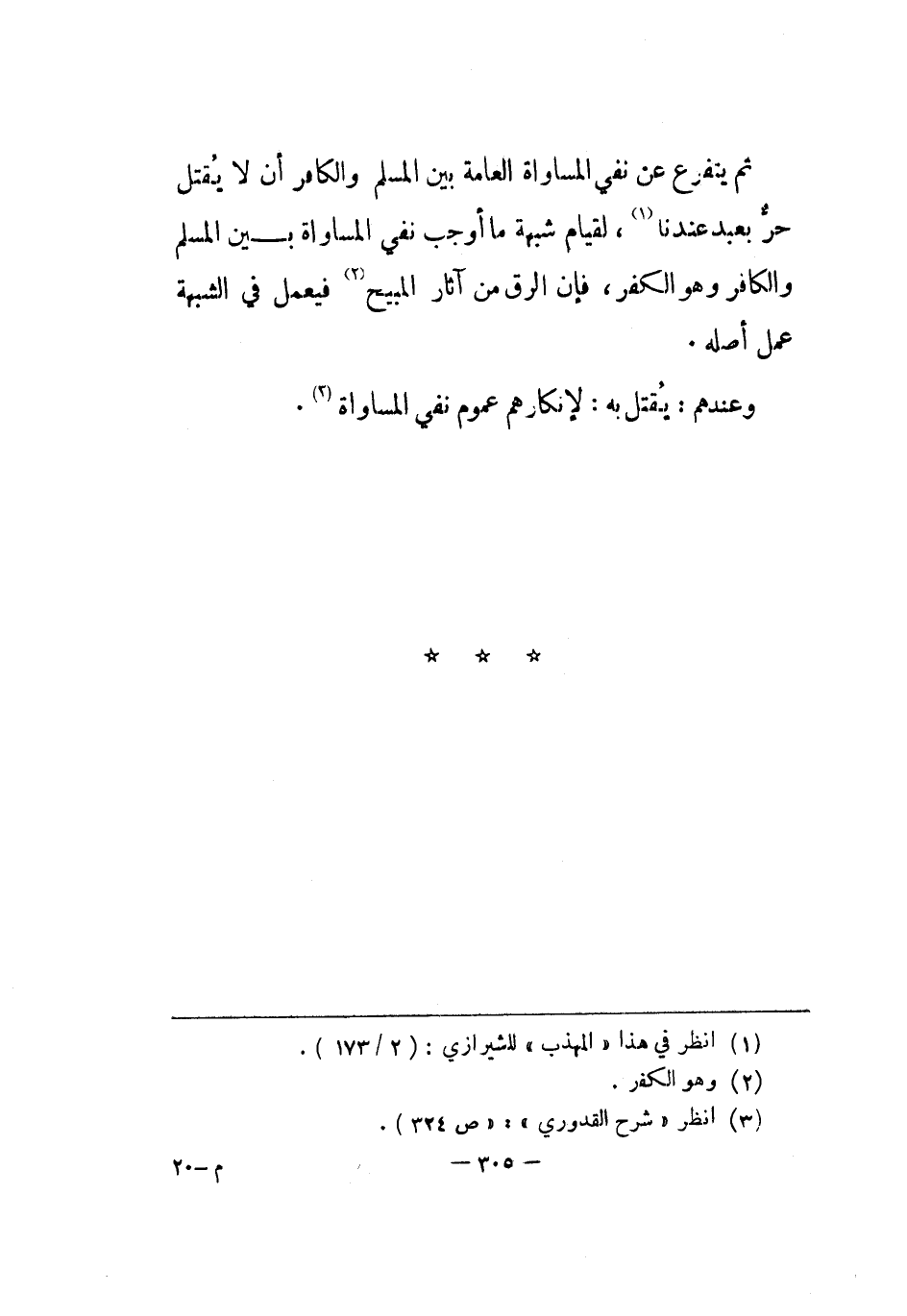 ثمَّ يتَفَرَّع عَن نفي الْمُسَاوَاة الْعَامَّة بَين الْمُسلم وَالْكَافِر أَن لَا يقتل حر بِعَبْد عندنَا لقِيَام شُبْهَة مَا أوجب نفي الْمُسَاوَاة بَين الْمُسلم وَالْكَافِر وَهُوَ الْكفْر فَإِن الرّقّ من آثَار الْمُبِيح فَيعْمل فِي الشُّبْهَة عمل أَصله