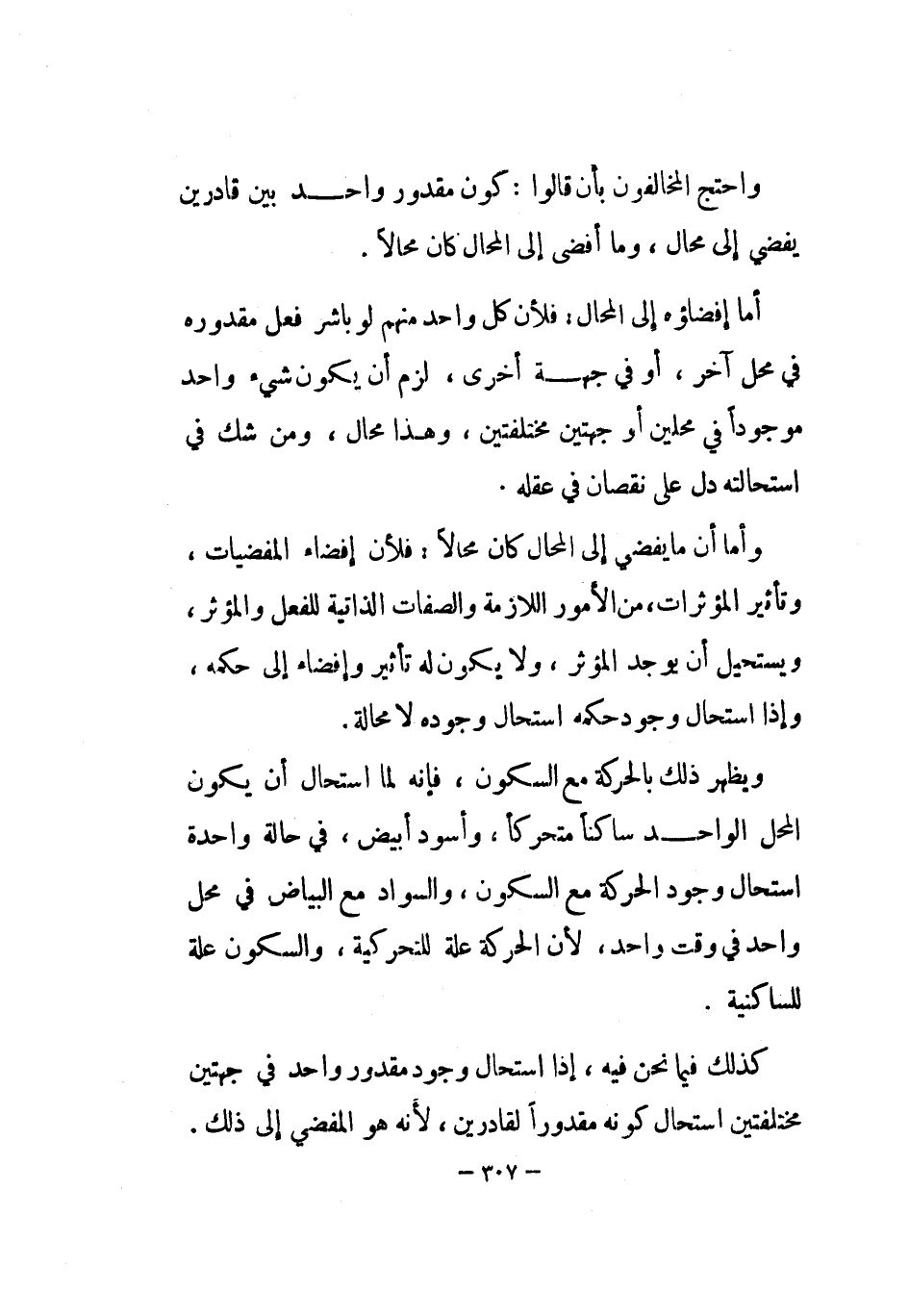 كَذَلِك فِيمَا نَحن فِيهِ إِذا اسْتَحَالَ وجود مَقْدُور وَاحِد فِي جِهَتَيْنِ مُخْتَلفين اسْتَحَالَ كَونه مَقْدُورًا لقادرين لِأَنَّهُ هُوَ المفضي إِلَى ذَلِك