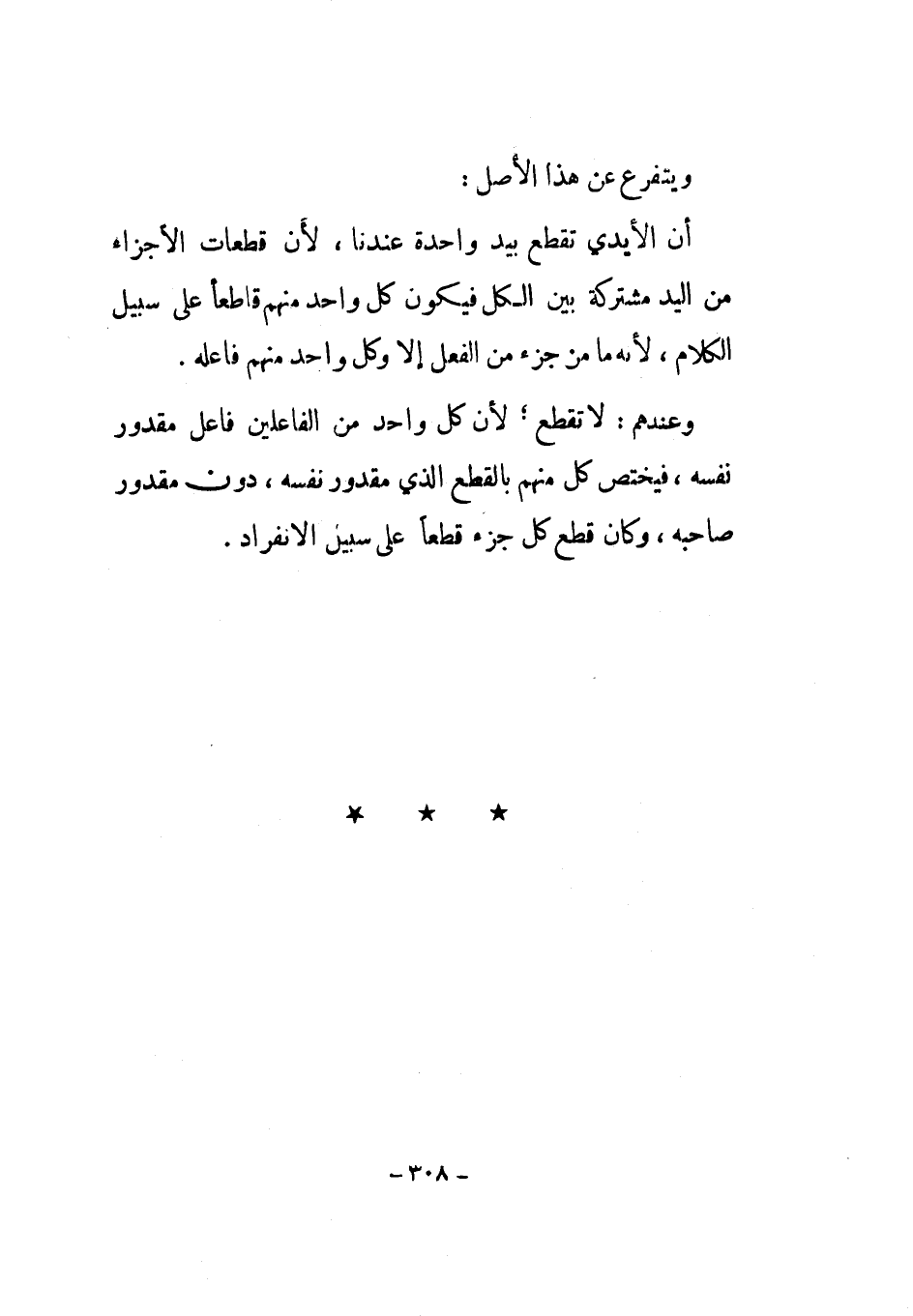 أَن الْأَيْدِي تقطع بيد وَاحِدَة عندنَا لِأَن قطعات الْأَجْزَاء من الْيَد الْمُشْتَركَة بَين الْكل فَيكون كل وَاحِد مِنْهُم قَاطعا على سَبِيل الْكَلَام لِأَنَّهُ مَا من جُزْء من الْفِعْل إِلَّا وكل وَاحِد مِنْهُم فَاعله