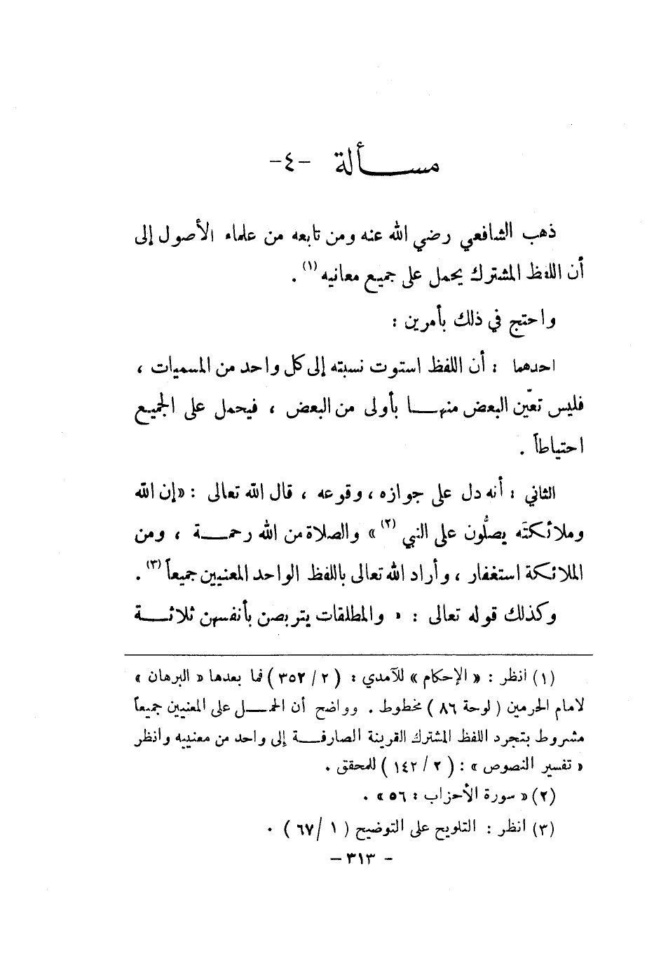 ذهب الشَّافِعِي رض وَمن تَابعه من عُلَمَاء الْأُصُول إِلَى أَن اللَّفْظ الْمُشْتَرك يحمل على جَمِيع مَعَانِيه