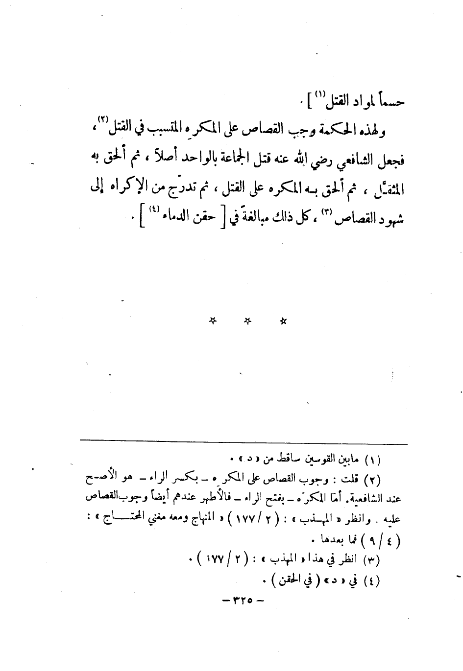 ولهذه الْحِكْمَة وَجب الْقصاص على الْمُكْره المتسبب فِي الْقَتْل فَجعل الشَّافِعِي رض قتل الْجَمَاعَة بِالْوَاحِدِ أصلا ثمَّ ألحق بِهِ المثقل ثمَّ ألحق بِهِ الْمُكْره على الْقَتْل ثمَّ تدرج من الْإِكْرَاه إِلَى شُهُود الْقصاص كل ذَلِك مُبَالغَة فِي حقن الدِّمَاء
