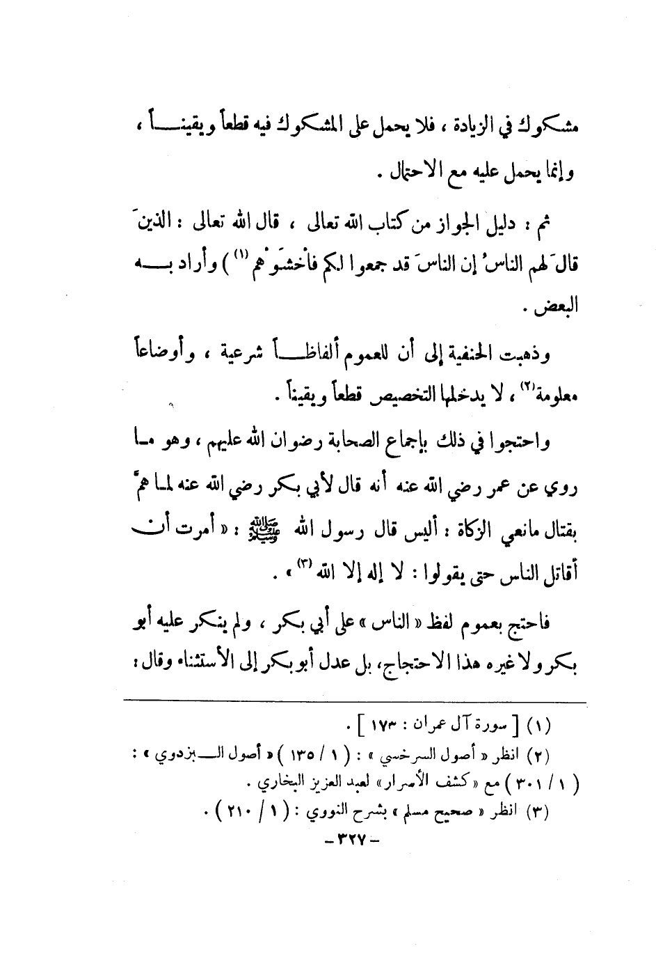 وَذَهَبت الْحَنَفِيَّة إِلَى أَن الْعُمُوم ألفاظا شَرْعِيَّة وأوضاعا مَعْلُومَة لَا يدخلهَا التَّخْصِيص قطعا ويقينا