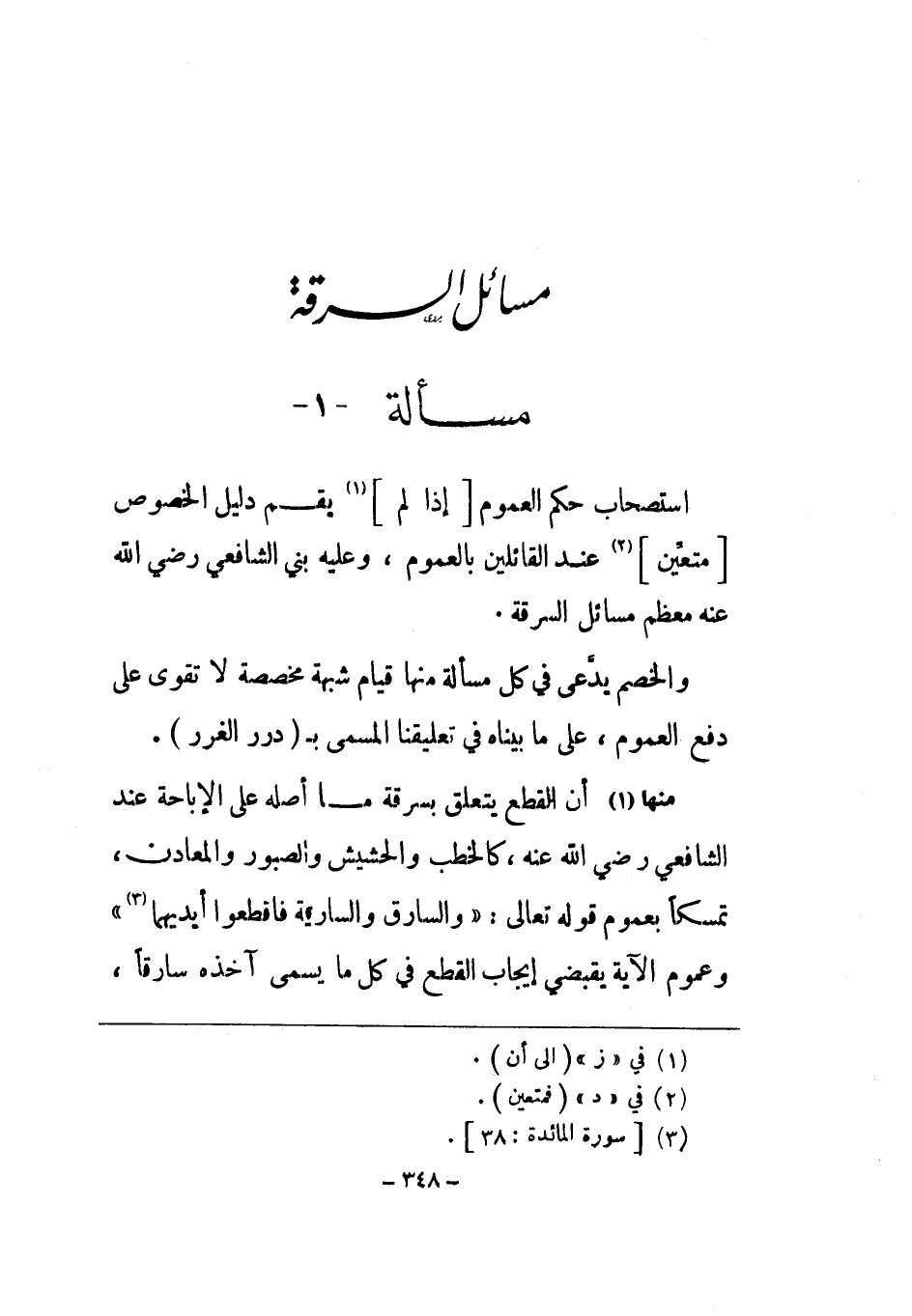 اسْتِصْحَاب حكم الْعُمُوم إِذا لم يقم دَلِيل الْخُصُوص مُتَعَيّن عِنْد الْقَائِلين بِالْعُمُومِ وَعَلِيهِ بني الشَّافِعِي رض مُعظم مسَائِل السّرقَة