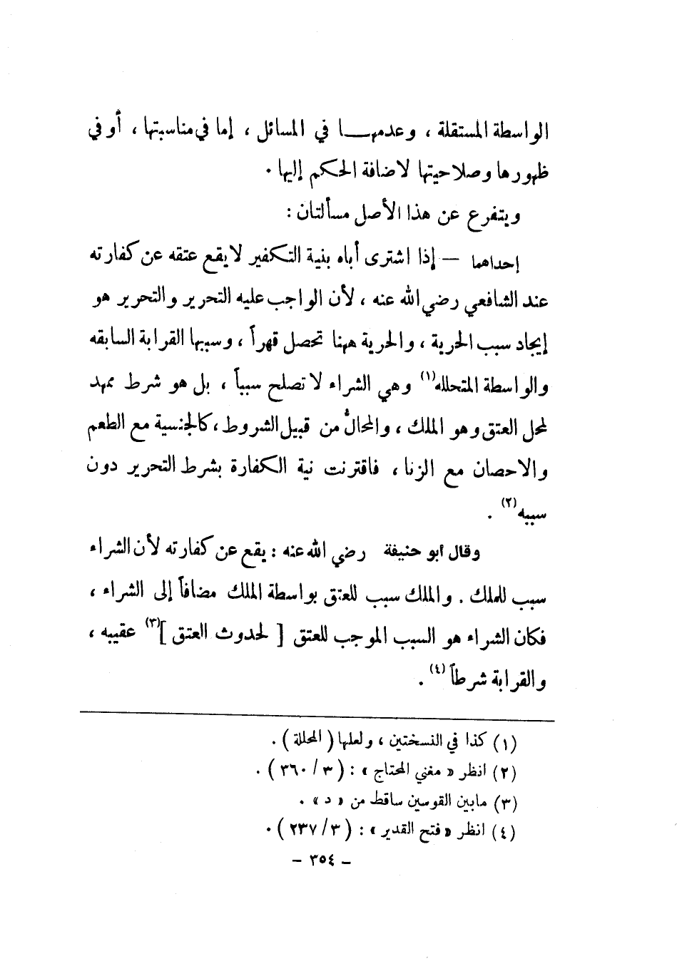 إِحْدَاهمَا إِذا أشترى أَبَاهُ بنيه بالتكفير لَا يَقع عتقه عَن كَفَّارَته عِنْد الشَّافِعِي رض لِأَن الْوَاجِب عَلَيْهِ التَّحْرِير والتحرير هُوَ إِيجَاد سَبَب الْحُرِّيَّة وَالْحريَّة هَهُنَا تحصل قهرا وسببها الْقَرَابَة السَّابِقَة الْوَاسِطَة المتحللة وَهِي الشِّرَاء لَا تصلح سَببا بل هُوَ شَرط ممهد لمحل الْمُعْتق وَهُوَ الْملك والمحال من قبيل الشَّرْط كالجنسية مَعَ الطّعْم والإحصان مَعَ الزِّنَا فاقترنت نِيَّة الْكَفَّارَة بِشَرْط التَّحْرِير دون سَببه