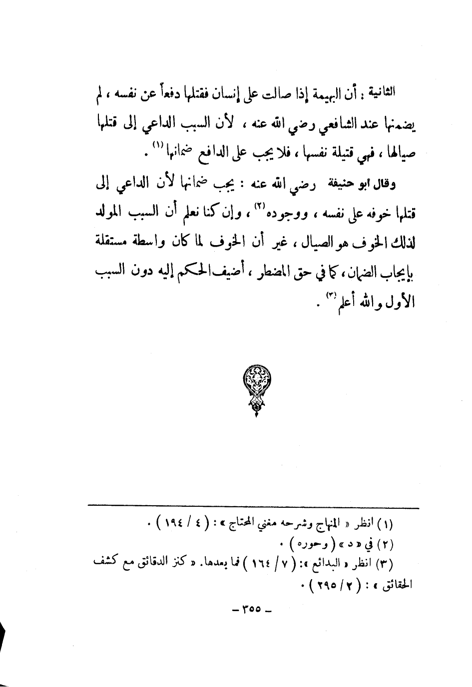 وَقَالَ أَبُو حنيفَة رض يجب ضَمَانهَا لِأَن الدَّاعِي إِلَى قَتلهَا خَوفه على نَفسه ووجوده وَإِن كُنَّا نعلم أَن السَّبَب المولد لذَلِك الْخَوْف هُوَ الصيال غير أَن الْخَوْف لما كَانَ وَاسِطَة مُسْتَقلَّة بِإِيجَاب الضَّمَان كَمَا فِي حق الْمُضْطَر أضيف الحكم إِلَيْهِ دون السَّبَب الأول وَالله أعلم