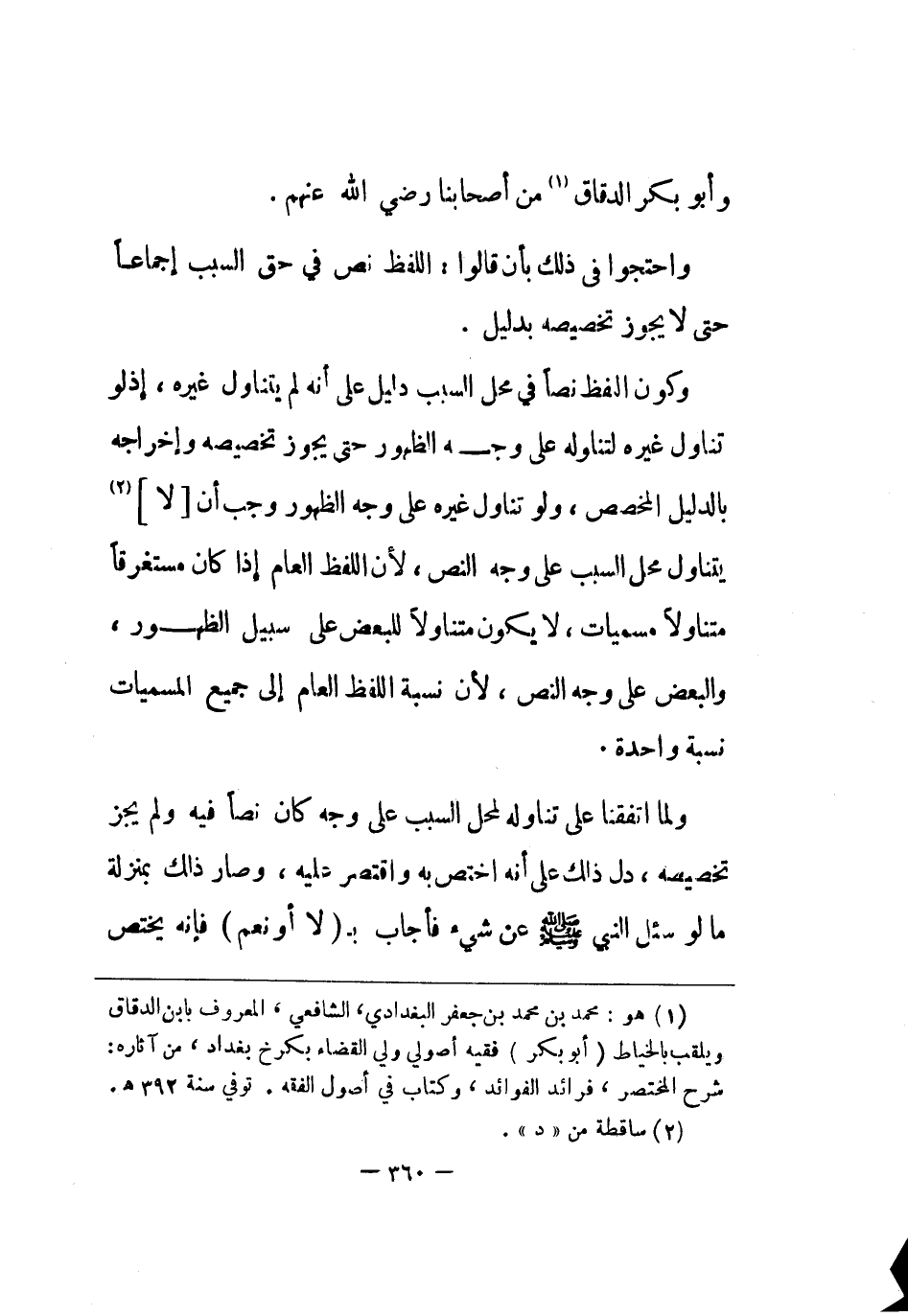 وَكَون اللَّفْظ نصا فِي مَحل السَّبَب دَلِيل على أَنه لم يتَنَاوَل غَيره إِذْ لَو تنَاول غَيره لتنَاوله على وَجه الظُّهُور حَتَّى يجوز تَخْصِيصه وإخراجه بِالدَّلِيلِ الْمُخَصّص وَلَو تنَاول غَيره على وَجه الظُّهُور وَجب أَن لَا يتَنَاوَل مَحل السَّبَب على وَجه النَّص لِأَن اللَّفْظ الْعَام إِذا كَانَ مُسْتَغْرقا متناولا مسميات لَا يكون متناولا للْبَعْض على سَبِيل الظُّهُور وَالْبَعْض على وَجه النَّص لِأَن نِسْبَة اللَّفْظ الْعَام إِلَى جَمِيع المسميات نِسْبَة وَاحِدَة