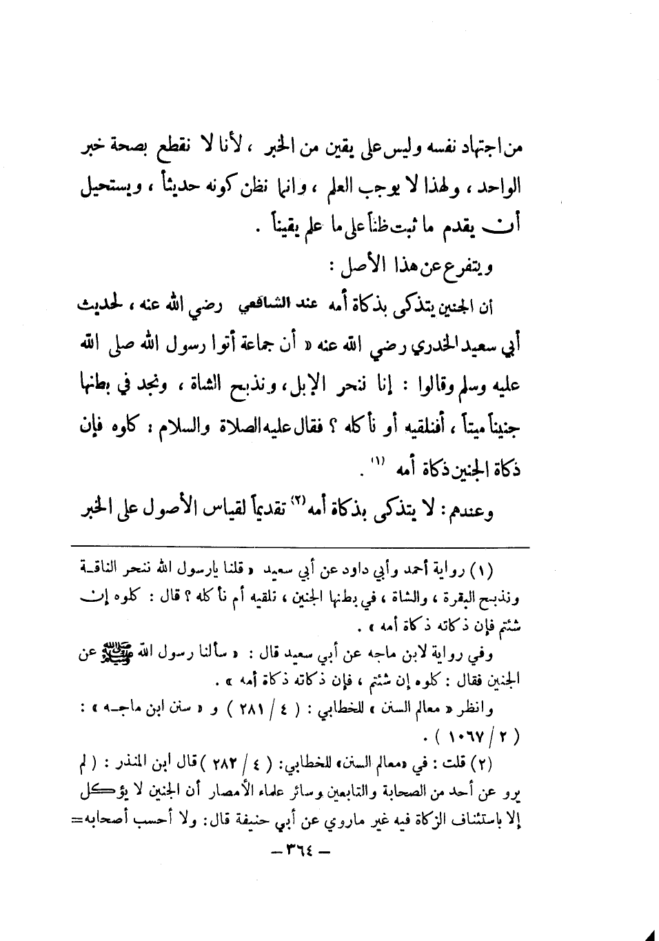 أَن الْجَنِين يتذكى بِذَكَاة أمه عِنْد الشَّافِعِي رض لحَدِيث أبي سعيد الْخُدْرِيّ رض إِن جمَاعَة أَتَوا الرَّسُول صلى الله عَلَيْهِ وَسلم وَقَالُوا إِنَّا نَنْحَر الْإِبِل ونذبح الشَّاة ونجد فِي بَطنهَا جَنِينا مَيتا أفنلقيه أَو نأكله فَقَالَ عَلَيْهِ الصَّلَاة وَالسَّلَام كلوه فَإِن ذَكَاة الْجَنِين ذَكَاة أمه