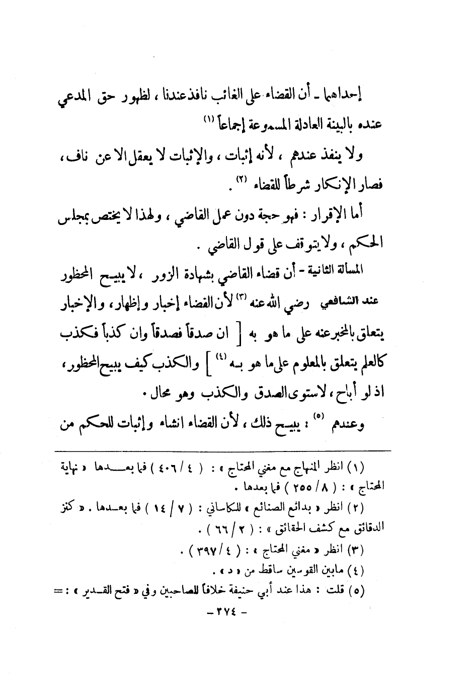 الْمَسْأَلَة الثَّانِيَة أَن قَضَاء القَاضِي بِشَهَادَة الزُّور لَا يُبِيح الْمَحْظُور عِنْد الشَّافِعِي رض لِأَن الفضاء إِخْبَار وَإِظْهَار والإخبار يتَعَلَّق بالمخبر عَنهُ على مَا هُوَ بِهِ إِن صدقا فصدقا وان كذبا فكذب كَالْعلمِ يتَعَلَّق بالمعلوم على مَا هُوَ بِهِ وَالْكذب كَيفَ يُبِيح الْمَحْظُور إِذْ لَو أَبَاحَ لاستوى الصدْق وَالْكذب وَهُوَ محَال