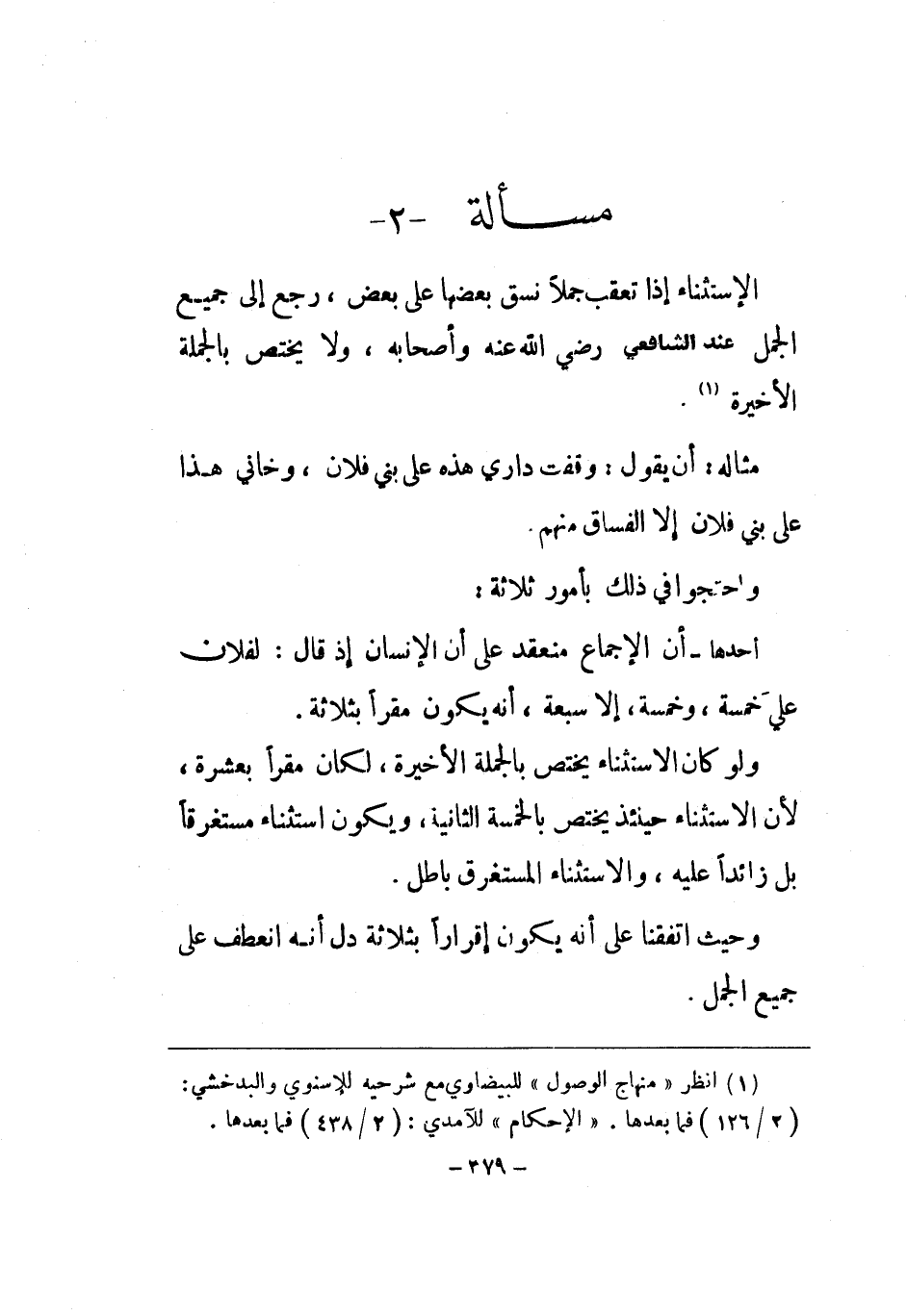 الِاسْتِثْنَاء إِذا تعقب جملا نسق بَعْضهَا على بعض رَجَعَ إِلَى جَمِيع الْجمل عِنْد الشَّافِعِي رض وَأَصْحَابه وَلَا يخْتَص بِالْجُمْلَةِ الْأَخِيرَة