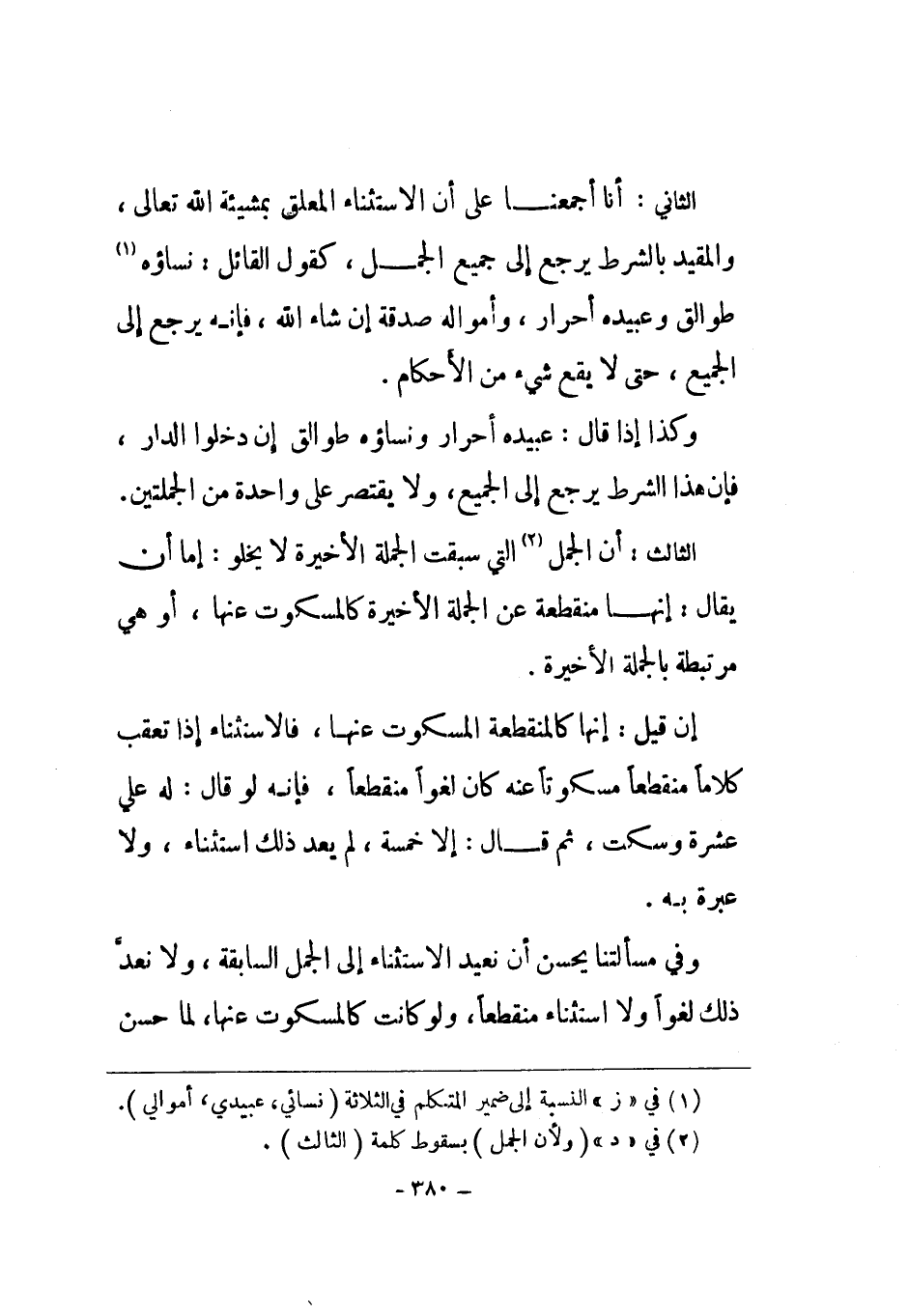الثَّانِي أَنا أجمعنا على أَن الِاسْتِثْنَاء الْمُعَلق بِمَشِيئَة الله تَعَالَى والمقيد بِالشّرطِ يرجع إِلَى جَمِيع الْجمل كَقَوْل الْقَائِل نساؤه طَوَالِق وعبيده أَحْرَار وأمواله صَدَقَة إِن شَاءَ الله فَإِنَّهُ يرجع إِلَى الْجَمِيع حَتَّى لَا يَقع شَيْء من الْأَحْكَام