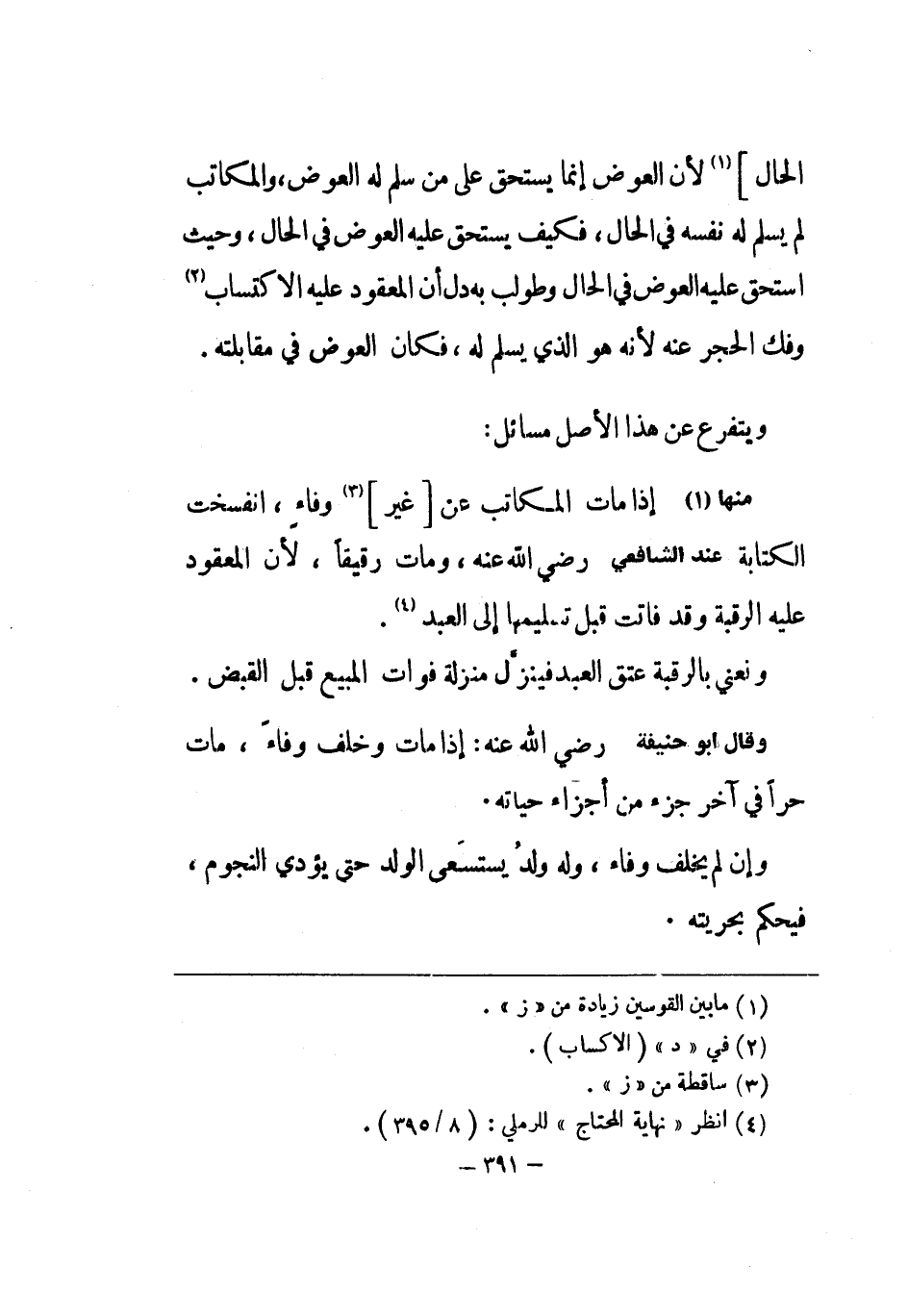 مِنْهَا إِذا مَاتَ الْمكَاتب عَن غير وَفَاء انْفَسَخت الْكِتَابَة عِنْد الشَّافِعِي رض وَمَات رَقِيقا لِأَن الْمَعْقُود عَلَيْهِ الرَّقَبَة وَقد فَاتَت قبل تَسْلِيمهَا إِلَى العَبْد