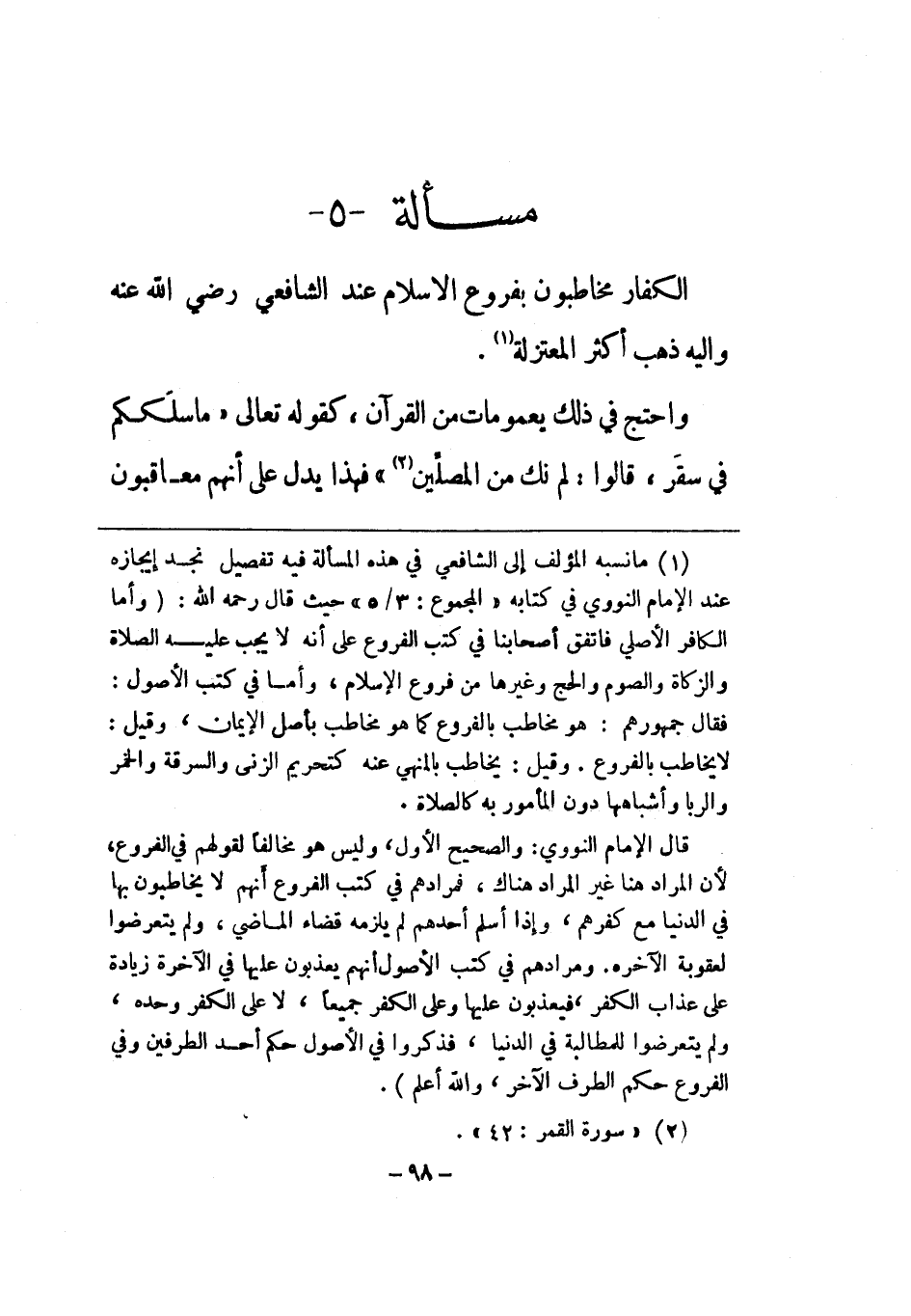 الْكفَّار مخاطبون بِفُرُوع الْإِسْلَام عِنْد الشَّافِعِي رض وَإِلَيْهِ ذهب أَكثر الْمُعْتَزلَة