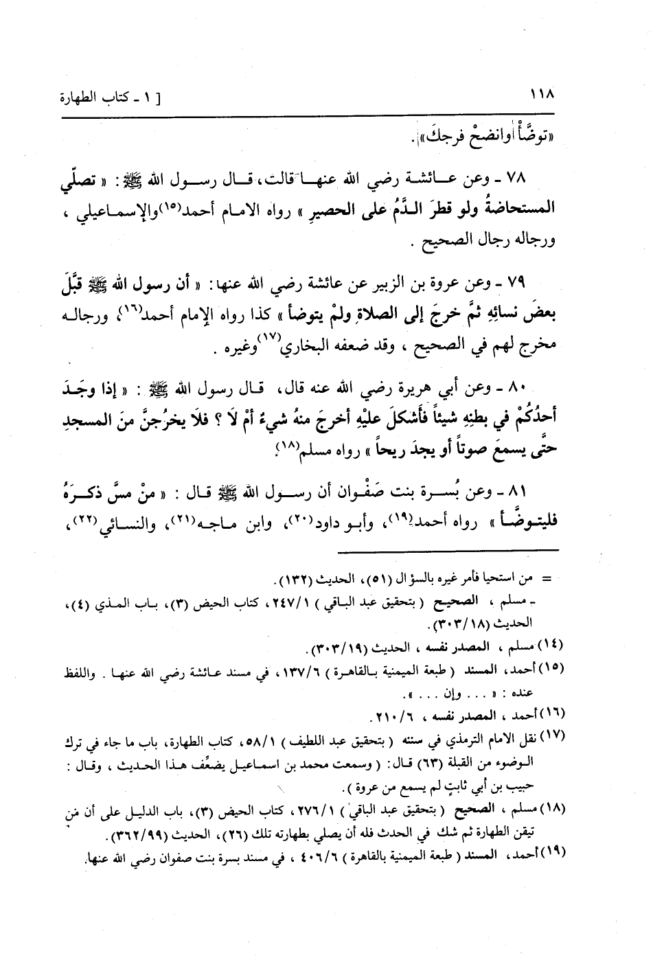 79 - وَعَن عُرْوَة بن الزبير عَن عَائِشَة رَضِيَ اللَّهُ عَنْها: " أَن رَسُول الله صَلَّى اللَّهُ عَلَيْهِ وَسَلَّم َ قبَّل بعض نِسَائِهِ ثمَّ خرج إِلَى الصَّلَاة وَلم يتَوَضَّأ " كَذَا رَوَاهُ الإِمَام أَحْمد، وَرِجَاله (مخرج لَهُم فِي الصَّحِيح، وَقد ضعفه البُخَارِيّ وَغَيره)