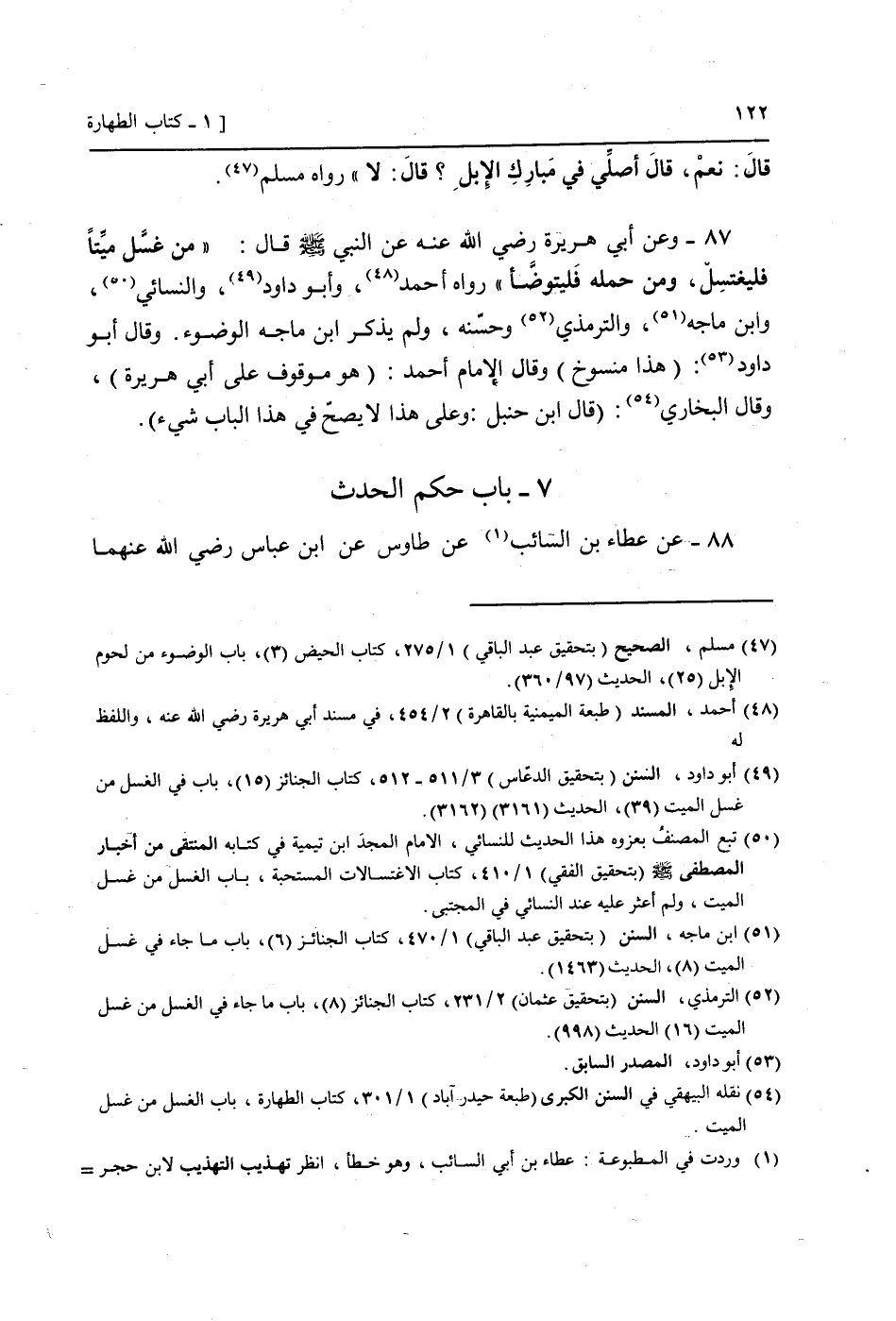 87 - وَعَن أبي هُرَيْرَة رَضِيَ اللَّهُ عَنْه عَن النَّبِي صَلَّى اللَّهُ عَلَيْهِ وَسَلَّم َ قَالَ: " من غسَّل مَيتا فليغتسل، وَمن حمله فَليَتَوَضَّأ " رَوَاهُ أَحْمد، وَأَبُو دَاوُد، وَالنَّسَائِيّ، وَابْن مَاجَه، (وَالتِّرْمِذِيّ وَحسنه، وَلم يذكر ابْن مَاجَه الْوضُوء. وَقَالَ أَبُو دَاوُد: (هَذَا مَنْسُوخ) وَقَالَ الإِمَام أَحْمد (هُوَ مَوْقُوف عَلَى أبي هُرَيْرَة) ، وَقَالَ البُخَارِيّ: (قَالَ ابْن حَنْبَل: وَعَلَى هَذَا لَا يَصح فِي هَذَا الْبَاب شَيْء)) .