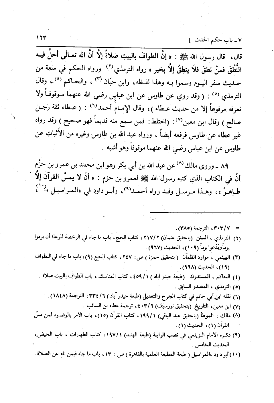 قَالَ، قَالَ رَسُول الله صَلَّى اللَّهُ عَلَيْهِ وَسَلَّم َ: " إِن الطّواف بِالْبَيْتِ صَلَاة إِلَّا أَن الله تَعَالَى أحل فِيهِ النُّطْق فَمن نطق فَلَا ينْطق إِلَّا بِخَير " رَوَاهُ التِّرْمِذِيّ وَرَوَاهُ الحكم فِي سَعَة من حَدِيث سفر الْيَوْم وَسموا بِهِ وَهَذَا لَفظه، وَابْن حبَان، وَالْحَاكِم، (وَقَالَ التِّرْمِذِيّ: (وَقد رُوِيَ عَن طَاوس عَن ابْن عَبَّاس رَضِيَ اللَّهُ عَنْهما مَوْقُوفا وَلَا نعرفه مَرْفُوعا إِلَّا من حَدِيث عَطاء) ، وَقَالَ الإِمَام أَحْمد: (عَطاء ثِقَة رجل صَالح) وَقَالَ ابْن معِين: (اخْتَلَط: فَمن سمع مِنْهُ قَدِيما فَهُوَ صَحِيح) وَقد رَوَاهُ غير عَطاء عَن طَاوس فرفعه أَيْضا، وَرَوَاهُ عبد الله بن طَاوس وَغَيره من الْأَثْبَات عَن طَاوس عَن ابْن عَبَّاس رَضِيَ اللَّهُ عَنْهما مَوْقُوفا وَهُوَ أشبه) .