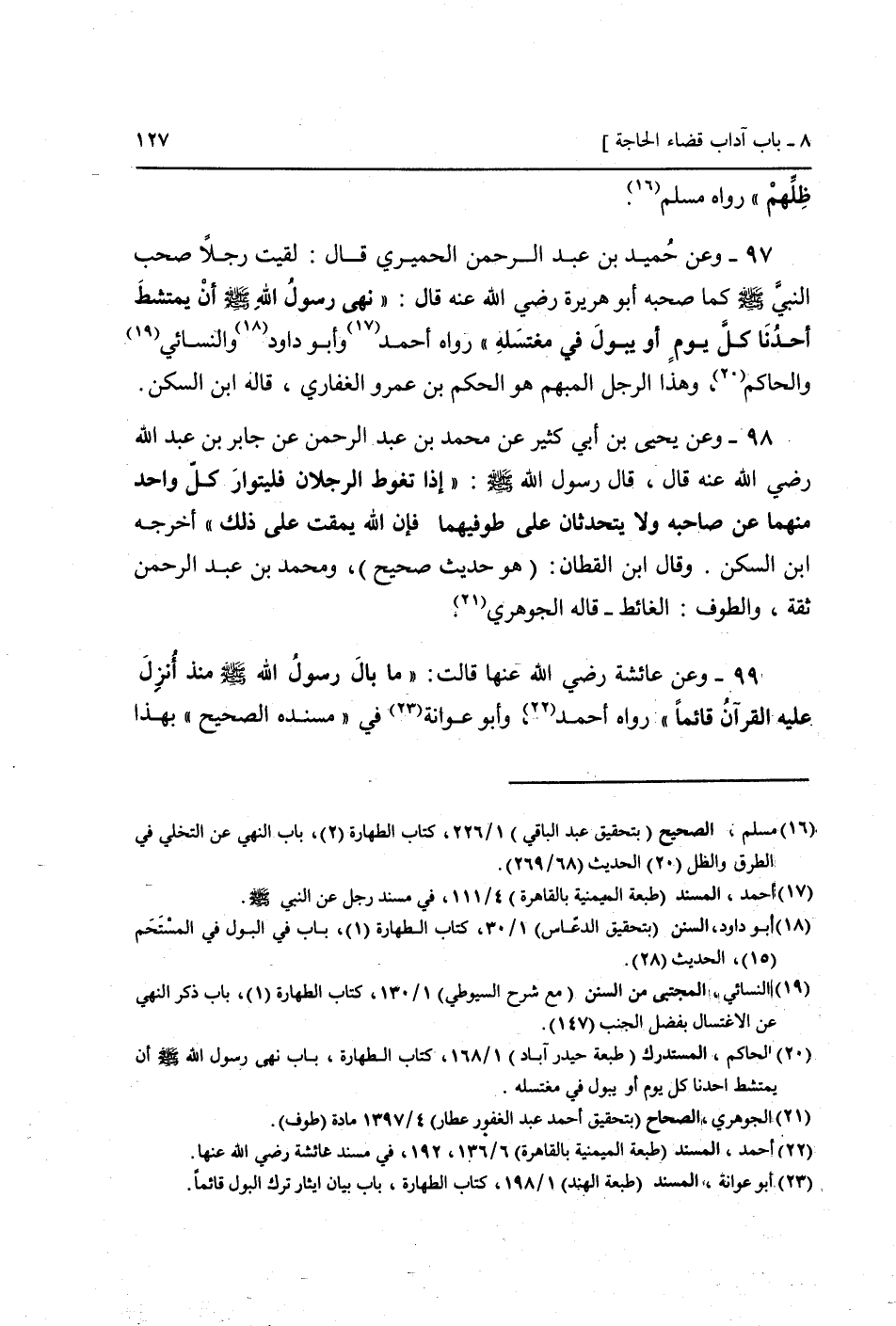 97 - وَعَن حميد بن عبد الرَّحْمَن الْحِمْيَرِي قَالَ: لقِيت رجلا صحب النَّبِي صَلَّى اللَّهُ عَلَيْهِ وَسَلَّم َ كَمَا صَحبه أَبُو هُرَيْرَة رَضِيَ اللَّهُ عَنْه قَالَ: " نهَى رَسُول الله أَن يمتشط أَحَدنَا كل يَوْم أَو يَبُول فِي مغتسله " رَوَاهُ أَحْمد وَأَبُو دَاوُد وَالنَّسَائِيّ وَالْحَاكِم، وَهَذَا الرجل الْمُبْهم هُوَ الحكم بن عَمْرو الْغِفَارِيّ، قَالَه ابْن السكن.