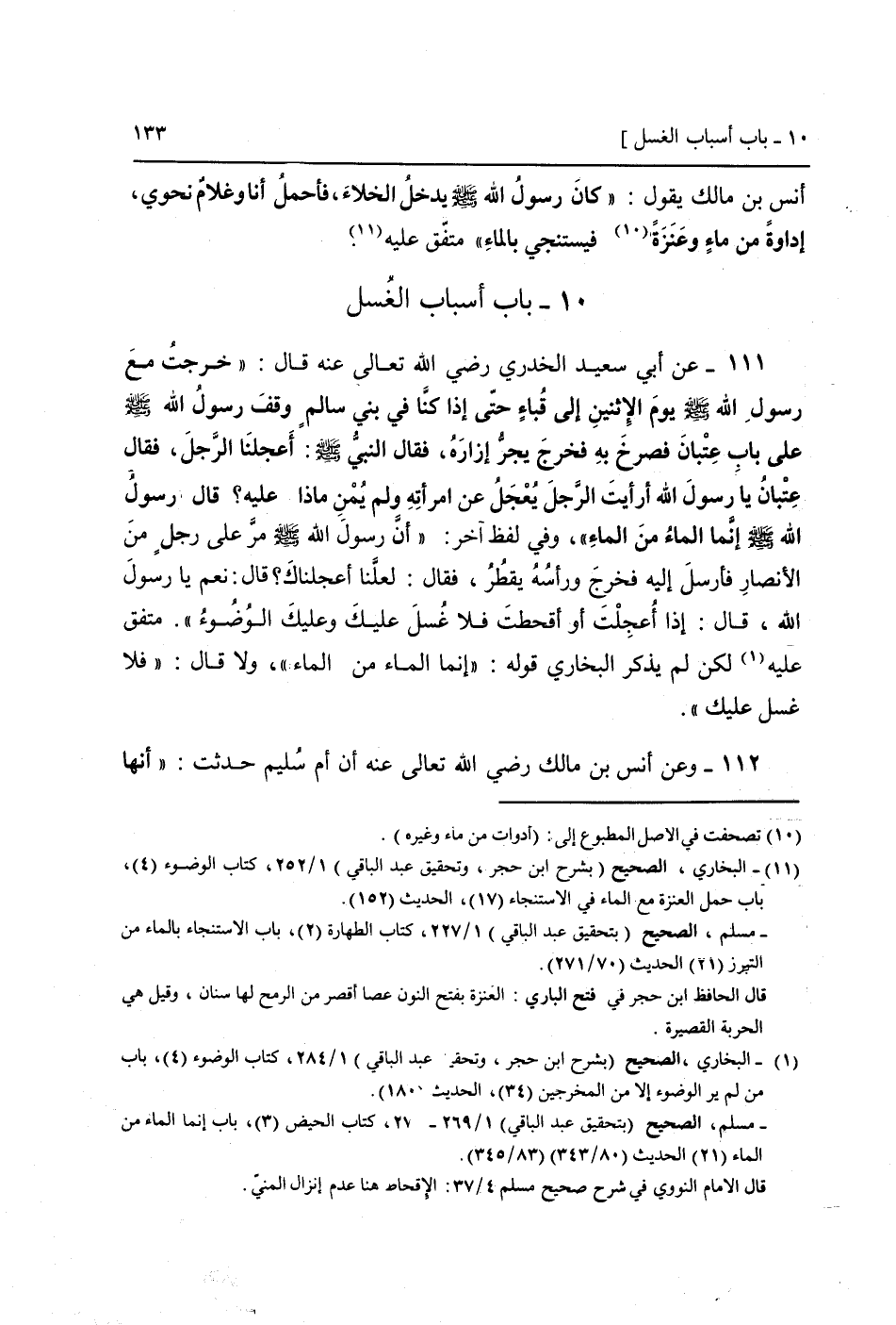 111 - عَن أبي سعيد الْخُدْرِيّ رَضِي الله تَعَالَى عَنهُ قَالَ: " خرجت مَعَ رَسُول الله صَلَّى اللَّهُ عَلَيْهِ وَسَلَّم َ يَوْم الْإِثْنَيْنِ إِلَى قبَاء حَتَّى إِذا كُنَّا فِي بني سَالم وقف رَسُول الله صَلَّى اللَّهُ عَلَيْهِ وَسَلَّم َ عَلَى بَاب عتْبَان فَصَرَخَ بِهِ فَخرج يجر إزَاره، فَقَالَ النَّبِي صَلَّى اللَّهُ عَلَيْهِ وَسَلَّم َ: أعجلنا الرجل، فَقَالَ عتْبَان يَا رَسُول الله أَرَأَيْت الرجل يعجل عَن امْرَأَته وَلم يمن مَاذَا عَلَيْهِ؟ قَالَ رَسُول الله صَلَّى اللَّهُ عَلَيْهِ وَسَلَّم َ إِنَّمَا المَاء من المَاء "، وَفِي لفظ آخر: " أَن رَسُول الله صَلَّى اللَّهُ عَلَيْهِ وَسَلَّم َ مر عَلَى رجل من الْأَنْصَار فَأرْسل إِلَيْهِ فَخرج وَرَأسه يقطر، فَقَالَ: لَعَلَّنَا أعجلناك؟ قَالَ: نعم يَا رَسُول الله، قَالَ: إِذا أعجلت أَو أقحطت فَلَا غسل عَلَيْك وَعَلَيْك الْوضُوء ". مُتَّفق عَلَيْهِ لَكِن لم يذكر البُخَارِيّ قَوْله: " إِنَّمَا المَاء من المَاء "، وَلَا قَالَ: " فَلَا غسل عَلَيْك ".