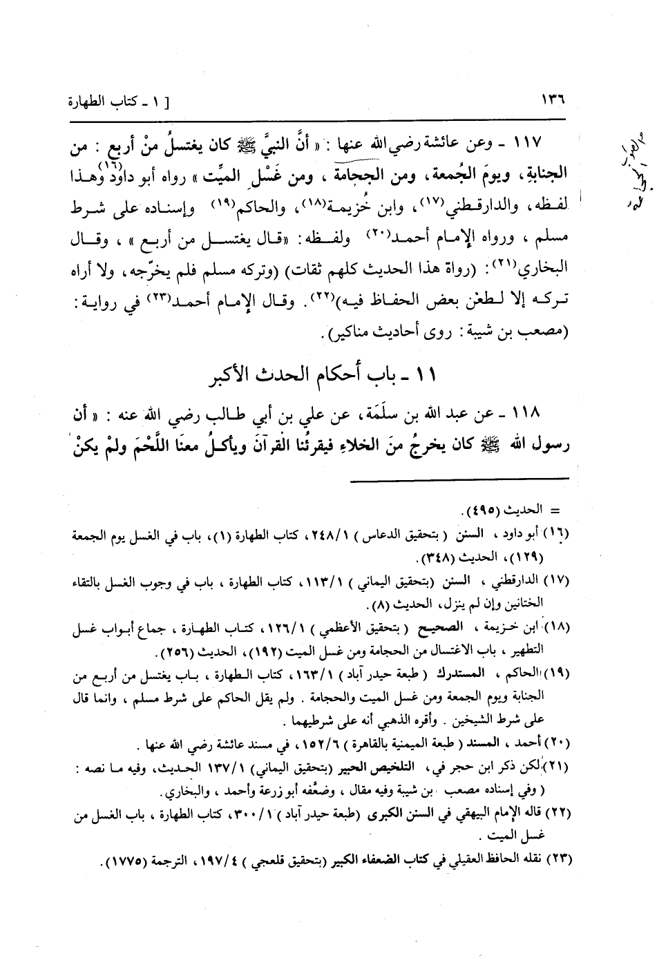 117 - وَعَن عَائِشَة رَضِيَ اللَّهُ عَنْها: " أَن النَّبِي صَلَّى اللَّهُ عَلَيْهِ وَسَلَّم َ كَانَ يغْتَسل من أَربع: من الْجَنَابَة، وَيَوْم الْجُمُعَة، وَمن الْحجامَة، وَمن غسل الْمَيِّت " رَوَاهُ أَبُو دَاوُد وَهَذَا لَفظه، وَالدَّارَقُطْنِيّ، وَابْن خُزَيْمَة، وَالْحَاكِم (وَإِسْنَاده عَلَى شَرط مُسلم، وَرَوَاهُ الإِمَام أَحْمد وَلَفظه: " قَالَ يغْتَسل من أَربع "، وَقَالَ البُخَارِيّ: (رُوَاة هَذَا الحَدِيث كلهم ثِقَات) (وَتَركه مُسلم فَلم يُخرجهُ، وَلَا أرَاهُ تَركه إِلَّا لطعن بعض الْحفاظ فِيهِ) . وَقَالَ الإِمَام أَحْمد فِي رِوَايَة: (مُصعب بن شيبَة: رَوَى أَحَادِيث مَنَاكِير)) .