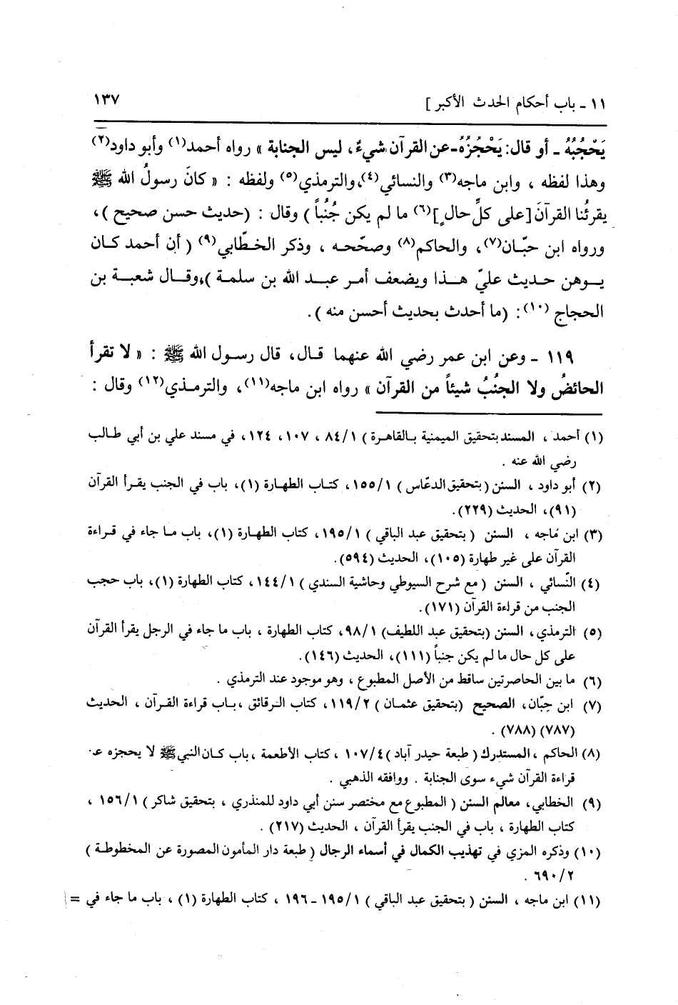 يَحْجُبهُ - أَو قَالَ: يحجزه - عَن الْقُرْآن شَيْء، لَيْسَ الْجَنَابَة " رَوَاهُ أَحْمد وَأَبُو دَاوُد وَهَذَا لَفظه، وَابْن مَاجَه وَالنَّسَائِيّ، وَالتِّرْمِذِيّ وَلَفظه: " كَانَ رَسُول الله صَلَّى اللَّهُ عَلَيْهِ وَسَلَّم َ يقرئنا الْقُرْآن [عَلَى كل حَال] مَا لم يكن جُنُباً) (وَقَالَ: (حَدِيث حسن صَحِيح) ، وَرَوَاهُ ابْن حبَان، وَالْحَاكِم وَصَححهُ، وَذكر الْخطابِيّ (أَن أَحْمد كَانَ يوهن حَدِيث عَلّي هَذَا ويضعف أَمر عبد الله بن سَلمَة) ، وَقَالَ شُعْبَة بن الْحجَّاج: (مَا أحدث بِحَدِيث أحسن مِنْهُ))
