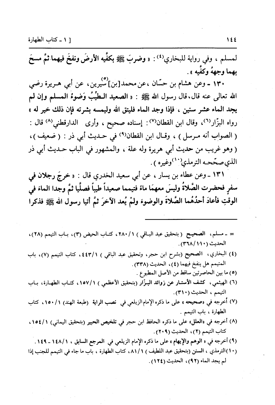 130 - وَعَن هِشَام بن حسان، عَن مُحَمَّد [بن] سِيرِين، عَن أبي هُرَيْرَة رَضِي الله تَعَالَى عَنهُ قَالَ، قَالَ رَسُول الله صَلَّى اللَّهُ عَلَيْهِ وَسَلَّم َ: " الصَّعِيد الطّيب وضوء الْمُسلم وَإِن لم يجد المَاء عشر سِنِين، فَإِذا وجد المَاء فليتق الله وليمسه بَشرته فَإِن ذَلِك خير لَهُ " رَوَاهُ الْبَزَّار، (وَقَالَ ابْن الْقطَّان: إِسْنَاده صَحِيح، وَأرَى الدَّارَقُطْنِيّ قَالَ: (الصَّوَاب أَنه مُرْسل) ، وَقَالَ ابْن الْقطَّان فِي حَدِيث أبي ذَر: (ضَعِيف) ، (وَهُوَ غَرِيب من حَدِيث أبي هُرَيْرَة وَله عِلّة، وَالْمَشْهُور فِي الْبَاب حَدِيث أبي ذَر الَّذِي صَححهُ التِّرْمِذِيّ وَغَيره)) .