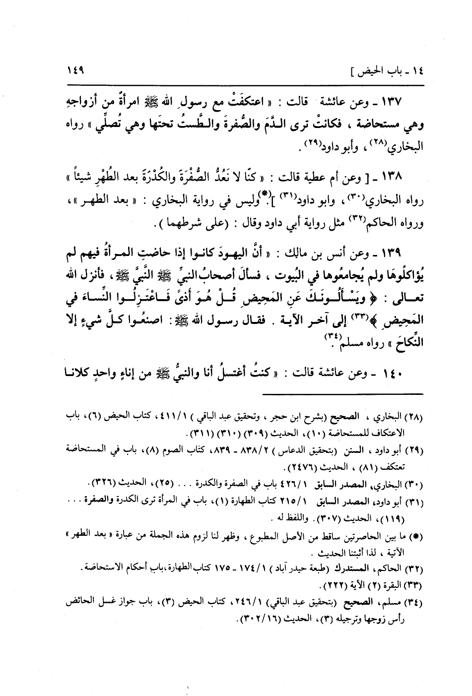 137 - وَعَن عَائِشَة قَالَت: " اعتكفت مَعَ رَسُول الله صَلَّى اللَّهُ عَلَيْهِ وَسَلَّم َ امْرَأَة من أَزوَاجه وَهِي مُسْتَحَاضَة، فَكَانَت ترَى الدَّم والصفرة والطست تحتهَا وَهِي تصلي " رَوَاهُ البُخَارِيّ، وَأَبُو دَاوُد.