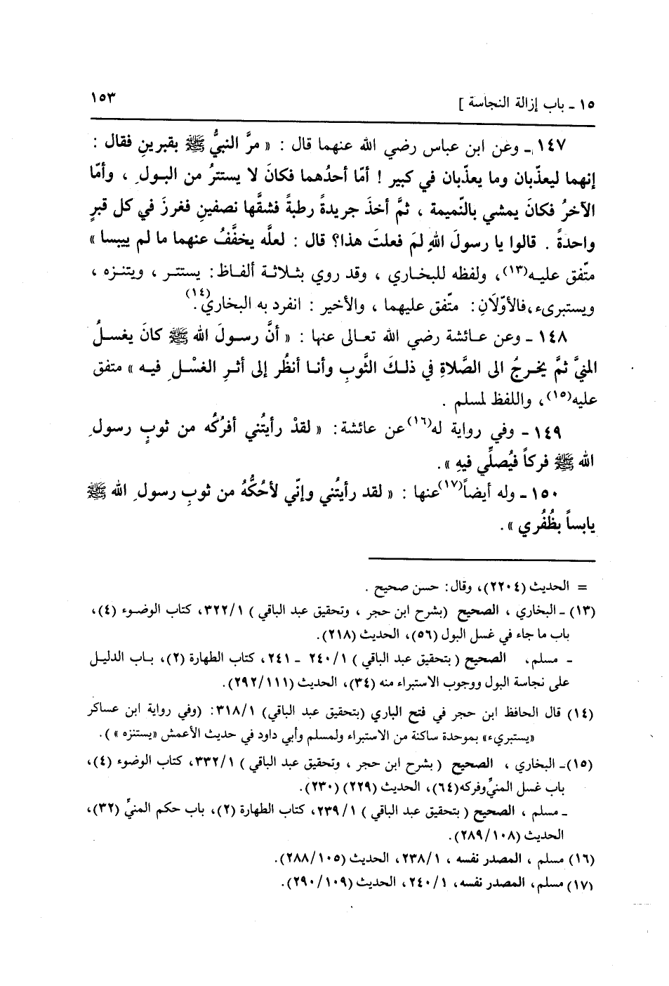 147 - وَعَن ابْن عَبَّاس رَضِيَ اللَّهُ عَنْهما قَالَ: " مر النَّبِي صَلَّى اللَّهُ عَلَيْهِ وَسَلَّم َ بقبرين فَقَالَ: إنَّهُمَا ليعذبان وَمَا يعذبان فِي كَبِير! أما أَحدهمَا فَكَانَ لَا يسْتَتر من الْبَوْل، وَأما الآخر فَكَانَ يمشي بالنميمة، ثمَّ أَخذ جَرِيدَة رطبَة فَشَقهَا نِصْفَيْنِ فغرز فِي كل قبر وَاحِدَة. قَالُوا يَا رَسُول الله لم فعلت هَذَا؟ قَالَ: لَعَلَّه يُخَفف عَنْهُمَا مَا لم ييبسا " مُتَّفق عَلَيْهِ، وَلَفظه للْبُخَارِيّ، وَقد رُوِيَ بِثَلَاثَة أَلْفَاظ: يسْتَتر، ويتنزه، ويستبرئ، فالأولان: مُتَّفق عَلَيْهِمَا، والأخير: انْفَرد بِهِ البُخَارِيّ.