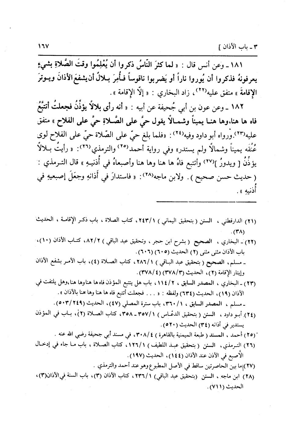 181 - وَعَن أنس قَالَ: " لما كثر النَّاس ذكرُوا أَن يُعلموا وَقت الصَّلَاة بِشَيْء يعرفونه فَذكرُوا أَن يوروا نَارا أَو يضْربُوا ناقوساً فأُمر بِلَال أَن يشفع الْأَذَان ويوتر الْإِقَامَة " مُتَّفق عَلَيْهِ، زَاد البُخَارِيّ: " إِلَّا الْإِقَامَة ".