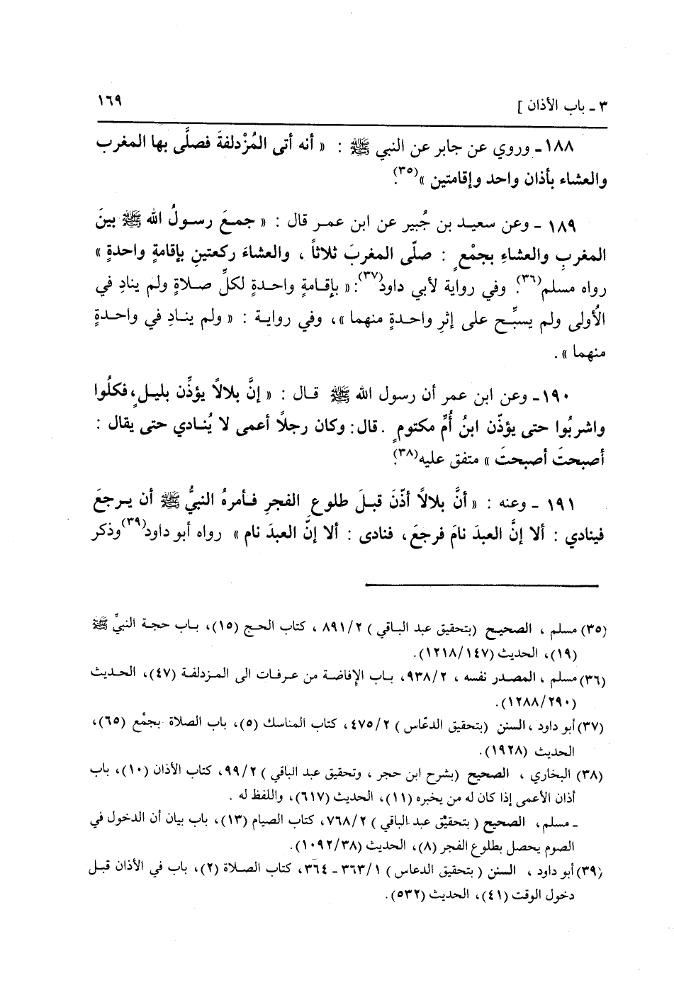 188 - وَرُوِيَ عَن جَابر عَن النَّبِي صَلَّى اللَّهُ عَلَيْهِ وَسَلَّم َ: " أَنه أَتَى الْمزْدَلِفَة فَصَلى بهَا الْمغرب وَالْعشَاء بِأَذَان وَاحِد وَإِقَامَتَيْنِ ".