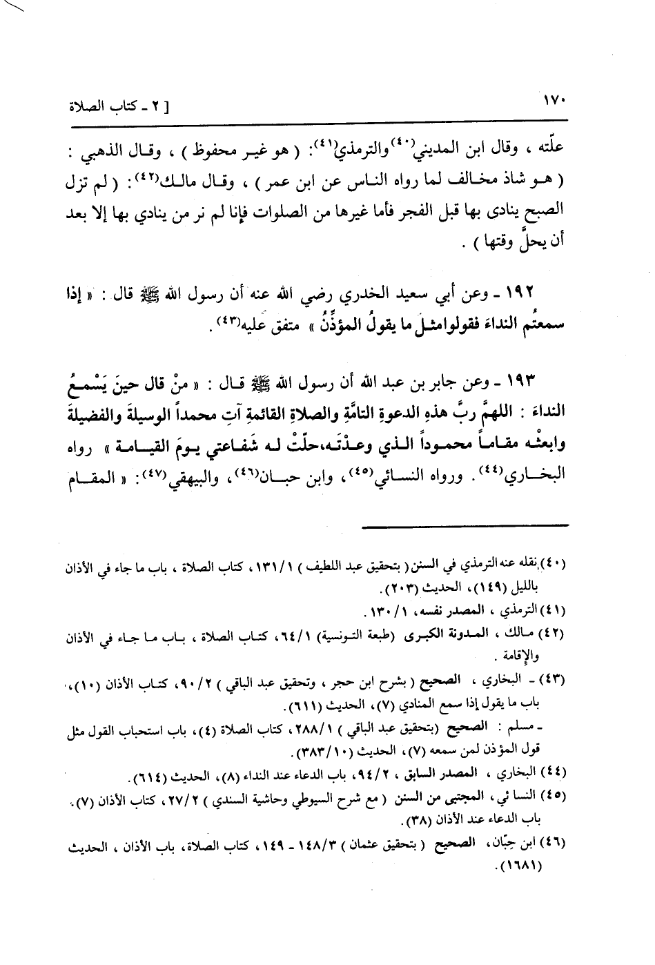 193 - وَعَن جَابر بن عبد الله أَن رَسُول الله صَلَّى اللَّهُ عَلَيْهِ وَسَلَّم َ قَالَ: " من قَالَ حِين يسمع النداء: اللَّهُمَّ رب هَذِه الدعْوَة التَّامَّة وَالصَّلَاة الْقَائِمَة آتٍ مُحَمَّدًا الْوَسِيلَة والفضيلة وابعثه مقَاما مَحْمُودًا الَّذِي وعدته، حلت لَهُ شَفَاعَتِي يَوْم الْقِيَامَة " رَوَاهُ البُخَارِيّ. وَرَوَاهُ النَّسَائِيّ، وَابْن حبَان، وَالْبَيْهَقِيّ: " الْمقَام