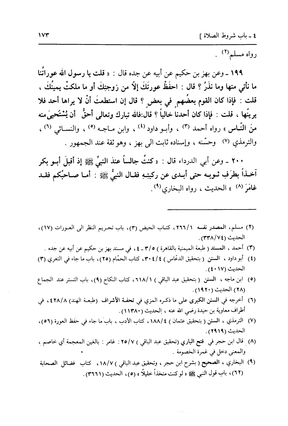 199 - وَعَن بهز بن حَكِيم عَن أَبِيه عَن جده قَالَ: " قلت يَا رَسُول الله عوراتنا مَا نأتي مِنْهَا وَمَا نذر؟ قَالَ: احفظ عورتك إِلَّا من زَوجتك أَو مَا ملكت يَمِينك، قلت: فَإِذا كَانَ الْقَوْم بَعضهم فِي بعض؟ قَالَ إِن اسْتَطَعْت أَن لَا يَرَاهَا أحد فَلَا يرينها، قلت: فَإِذا كَانَ أَحَدنَا خَالِيا؟ قَالَ: فَالله تبَارك وَتَعَالَى أَحَق أَن يستحيى مِنْهُ من النَّاس " رَوَاهُ أَحْمد، وَأَبُو دَاوُد، وَابْن ماجة، وَالنَّسَائِيّ، (وَالتِّرْمِذِيّ وَحسنه، وَإِسْنَاده ثَابت إِلَى بهز، وَهُوَ ثِقَة عِنْد الْجُمْهُور) .