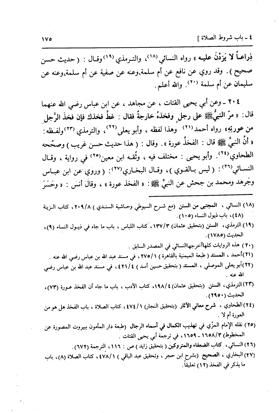 204 - وَعَن أبي يَحْيَى القَتَّات، عَن مُجَاهِد، عَن ابْن عَبَّاس رَضِيَ اللَّهُ عَنْهما قَالَ: " مر النَّبِي صَلَّى اللَّهُ عَلَيْهِ وَسَلَّم َ عَلَى رجل وَفَخذه خَارِجَة فَقَالَ: غط فخذك فَإِن فَخذ الرجل من عَوْرَته " رَوَاهُ أَحْمد وَهَذَا لَفظه، وَأَبُو يعْلى، (وَالتِّرْمِذِيّ وَلَفظه: " أَن النَّبِي صَلَّى اللَّهُ عَلَيْهِ وَسَلَّم َ قَالَ: الْفَخْذ عَورَة ". وَقَالَ: (هَذَا حَدِيث حسن غَرِيب) وَصَححهُ الطَّحَاوِيّ. وَأَبُو يَحْيَى: مُخْتَلف فِيهِ، وَثَّقَهُ ابْن معِين فِي رِوَايَة، وَقَالَ النَّسَائِيّ: (لَيْسَ بِالْقَوِيّ) ، وَقَالَ البُخَارِيّ: (وَرُوِيَ عَن ابْن عَبَّاس وجرهد وَمُحَمّد بن جحش عَن النَّبِي صَلَّى اللَّهُ عَلَيْهِ وَسَلَّم َ: " الْفَخْذ عَورَة "، وَقَالَ أنس: " وحسر