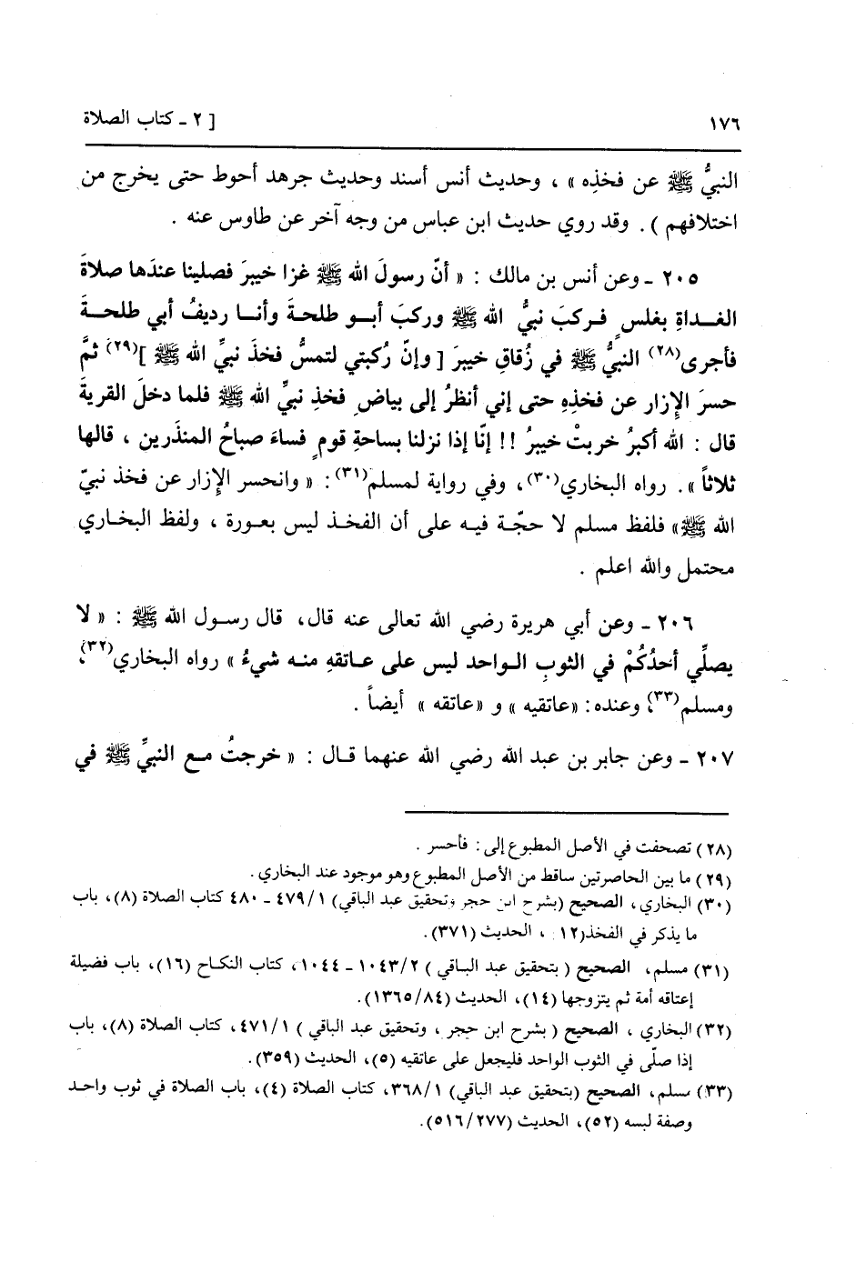 205 - وَعَن أنس بن مَالك: " أَن رَسُول الله صَلَّى اللَّهُ عَلَيْهِ وَسَلَّم َ غزا خَيْبَر فصلينا عِنْدهَا صَلَاة الْغَدَاة بِغَلَس فَركب نَبِي الله صَلَّى اللَّهُ عَلَيْهِ وَسَلَّم َ وَركب أَبُو طَلْحَة وَأَنا رَدِيف أبي طَلْحَة فَأَجْرَى النَّبِي صَلَّى اللَّهُ عَلَيْهِ وَسَلَّم َ فِي زقاق خَيْبَر [وَإِن ركبتي لتمس فَخذ نَبِي الله صَلَّى اللَّهُ عَلَيْهِ وَسَلَّم َ] ثمَّ حسر الْإِزَار عَن فَخذه حَتَّى إِنِّي أنظر إِلَى بَيَاض فَخذ نَبِي الله صَلَّى اللَّهُ عَلَيْهِ وَسَلَّم َ فَلَمَّا دخل الْقرْيَة قَالَ: الله أكبر خربَتْ خَيْبَر! ! إِنَّا إِذا نزلنَا بِسَاحَة قوم فسَاء صباح المنذَرين، قَالَهَا ثَلَاثًا ". رَوَاهُ البُخَارِيّ، وَفِي رِوَايَة لمُسلم: " وانحسر الْإِزَار عَن فَخذ نَبِي الله صَلَّى اللَّهُ عَلَيْهِ وَسَلَّم َ " (فَلفظ مُسلم لَا حجَّة فِيهِ عَلَى أَن الْفَخْذ لَيْسَ بِعَوْرَة، وَلَفظ البُخَارِيّ مُحْتَمل وَالله أعلم) .