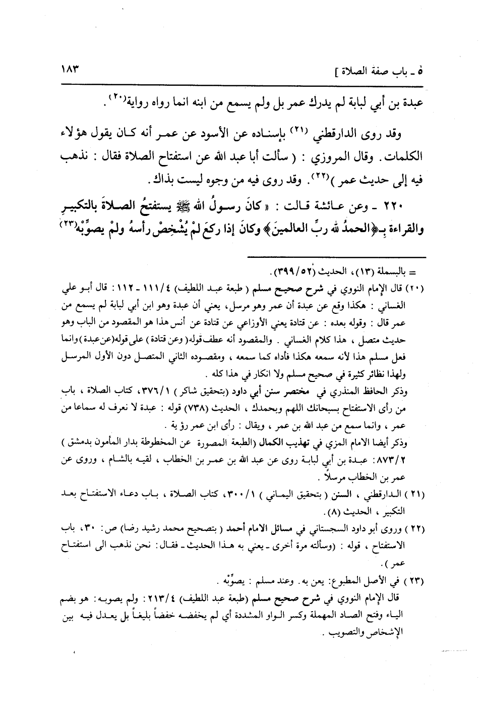عَبدة بن أبي لبَابَة لم يدْرك عمر بل وَلم يسمع من ابْنه إِنَّمَا رَوَاهُ رِوَايَة. وَقد رَوَى الدَّارَقُطْنِيّ بِإِسْنَادِهِ عَن الْأسود عَن عمر أَنه كَانَ يَقُول هَؤُلَاءِ الْكَلِمَات. وَقَالَ الْمروزِي: (سَأَلت أَبَا عبد الله عَن استفتاح الصَّلَاة فَقَالَ: نَذْهَب فِيهِ إِلَى حَدِيث عمر) . وَقد رَوَى فِيهِ من وُجُوه لَيست بِذَاكَ.