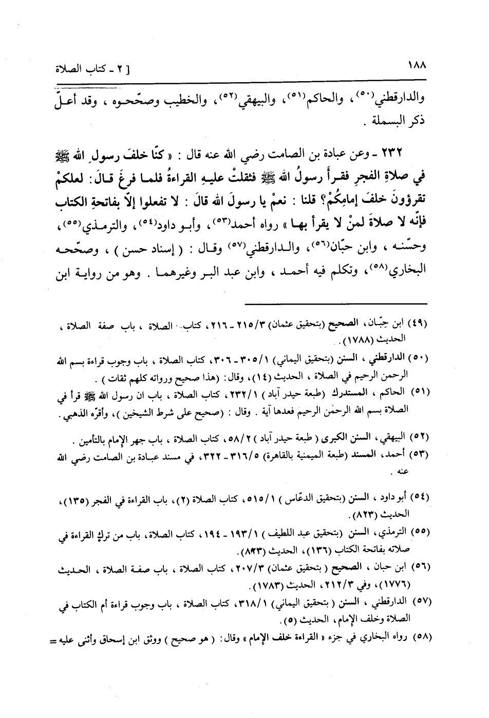 232 - وَعَن عبَادَة بن الصَّامِت رَضِيَ اللَّهُ عَنْه قَالَ: " كُنَّا خلف رَسُول الله صَلَّى اللَّهُ عَلَيْهِ وَسَلَّم َ فِي صَلَاة الْفجْر فَقَرَأَ رَسُول الله صَلَّى اللَّهُ عَلَيْهِ وَسَلَّم َ فَثقلَتْ عَلَيْهِ الْقِرَاءَة فَلَمَّا فرغ قَالَ: لَعَلَّكُمْ تقرؤون خلف إمامكم؟ قُلْنَا: نعم يَا رَسُول الله قَالَ: لَا تَفعلُوا إِلَّا بِفَاتِحَة الْكتاب فَإِنَّهُ لَا صَلَاة لمن لَا يقْرَأ بهَا " رَوَاهُ أَحْمد، وَأَبُو دَاوُد، (وَالتِّرْمِذِيّ، وَحسنه، وَابْن حبَان، وَالدَّارَقُطْنِيّ وَقَالَ: (إِسْنَاد حسن) ، وَصَححهُ البُخَارِيّ، وَتكلم فِيهِ أَحْمد، وَابْن عبد الْبر وَغَيرهمَا) . وَهُوَ من رِوَايَة ابْن