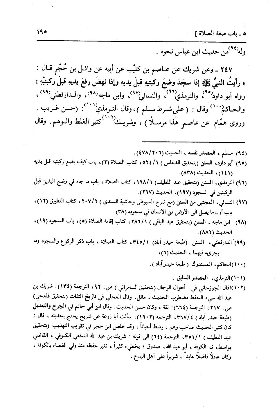 247 - وَعَن شريك عَن عَاصِم بن كُلَيْب عَن أَبِيه عَن وَائِل بن حُجْر قَالَ: " رَأَيْت النَّبِي صَلَّى اللَّهُ عَلَيْهِ وَسَلَّم َ إِذا سجد وضع رُكْبَتَيْهِ قبل يَدَيْهِ وَإِذا نَهَضَ رفع يَدَيْهِ قبل رُكْبَتَيْهِ " رَوَاهُ أَبُو دَاوُد، وَالتِّرْمِذِيّ، وَالنَّسَائِيّ، وَابْن مَاجَه، وَالدَّارَقُطْنِيّ، (وَالْحَاكِم وَقَالَ: (عَلَى شَرط مُسلم) ، وَقَالَ التِّرْمِذِيّ: (حسن غَرِيب. وَرَوَى همام عَن عَاصِم هَذَا مُرْسلا) ، وَشريك كثير الْغَلَط وَالوهم. وَقَالَ
