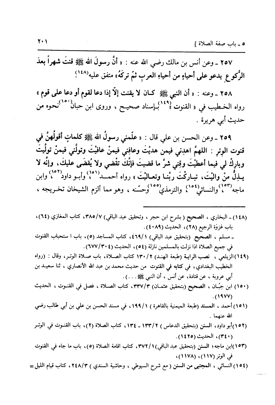 259 - وَعَن الْحسن بن عَلّي قَالَ: " عَلمنِي رَسُول الله صَلَّى اللَّهُ عَلَيْهِ وَسَلَّم َ كَلِمَات أقولهن فِي قنوت الْوتر: اللَّهُمَّ اهدني فِيمَن هديت وَعَافنِي فِيمَن عافيت وتولني فِيمَن توليت وَبَارك لي فِيمَا أَعْطَيْت وقني شَرّ مَا قضيت فَإنَّك تقضي وَلَا يُقضى عَلَيْك، وَإنَّهُ لَا يذل من واليت، تبَارك رَبنَا وَتَعَالَيْت " رَوَاهُ أَحْمد، وَأَبُو دَاوُد، وَابْن مَاجَه، وَالنَّسَائِيّ، (وَالتِّرْمِذِيّ وَحسنه، وَهُوَ مِمَّا ألزم الشَّيْخَانِ تَخْرِيجه) ،