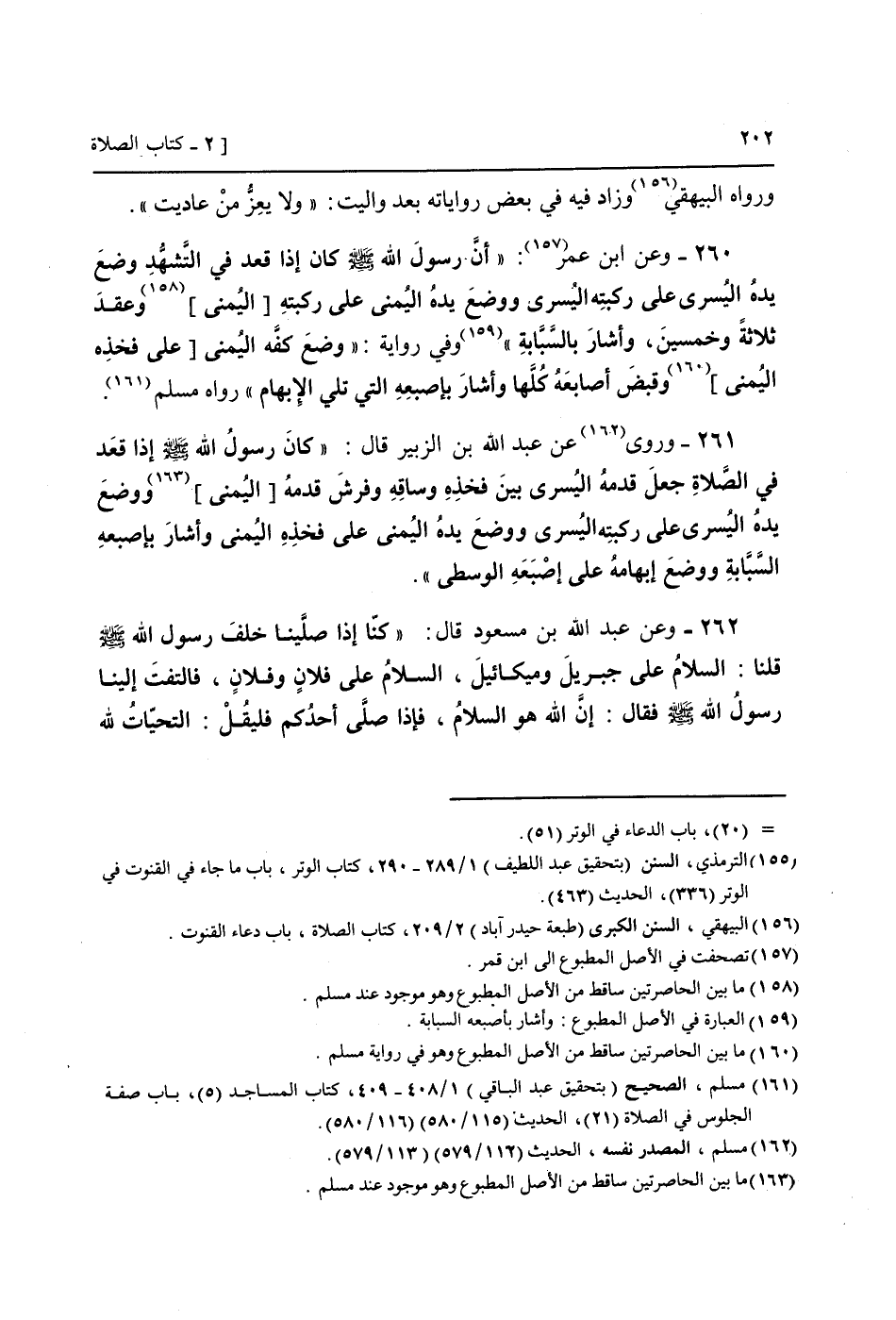 261 - وَرَوَى عَن عبد الله بن الزبير قَالَ: " كَانَ رَسُول الله صَلَّى اللَّهُ عَلَيْهِ وَسَلَّم َ إِذا قعد فِي الصَّلَاة جعل قدمه الْيُسْرَى بَين فَخذه وَسَاقه وفرش قدمه [الْيُمْنَى] وَوضع يَده الْيُسْرَى عَلَى ركبته الْيُسْرَى وَوضع يَده الْيُمْنَى عَلَى فَخذه الْيُمْنَى وَأَشَارَ بإصبعه السبابَة وَوضع إبهامه عَلَى إصبعه الْوُسْطَى ".