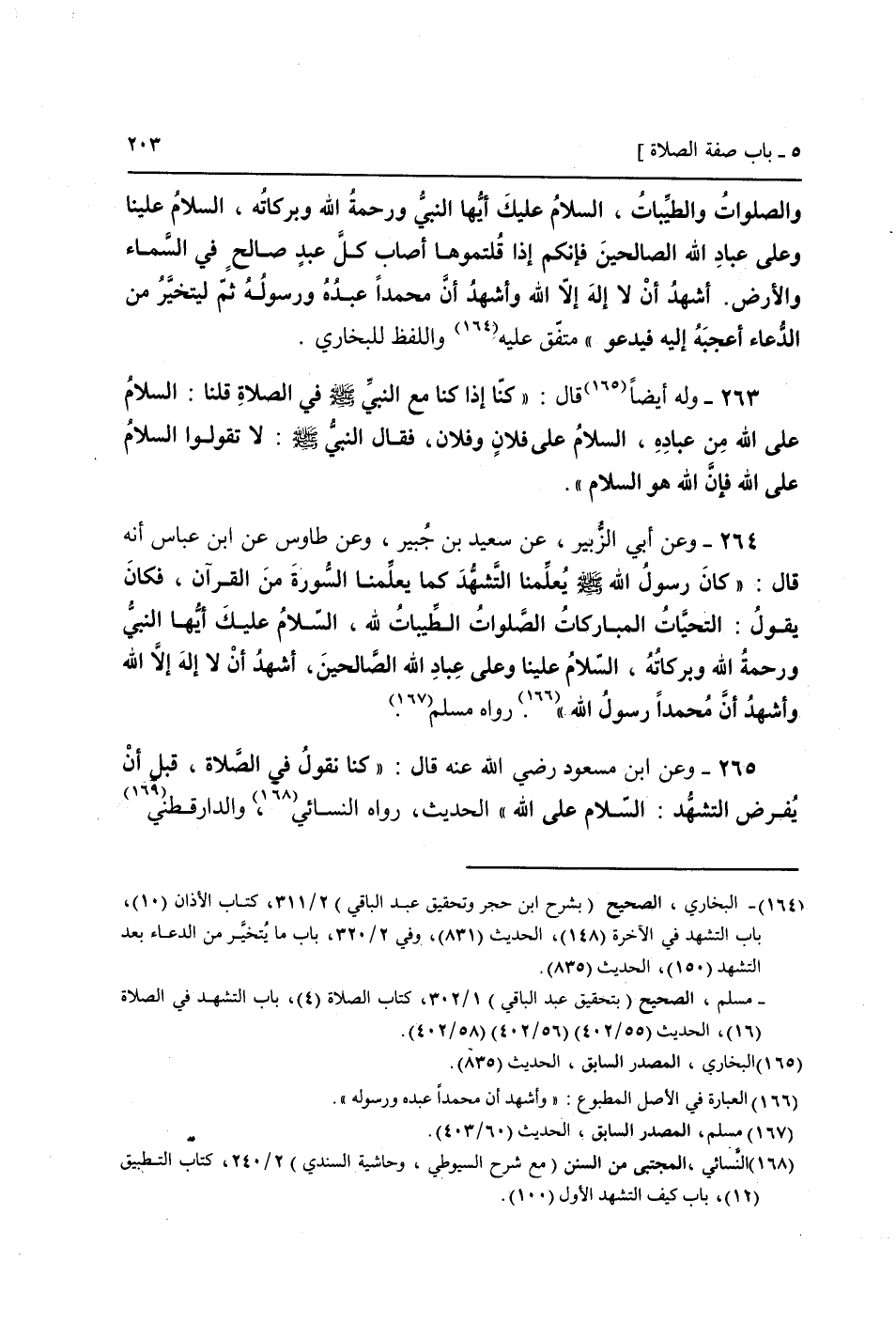 264 - وَعَن أبي الزبير، عَن سعيد بن جُبَير، وَعَن طَاوس عَن ابْن عَبَّاس أَنه قَالَ: " كَانَ رَسُول الله صَلَّى اللَّهُ عَلَيْهِ وَسَلَّم َ يعلمنَا التَّشَهُّد كَمَا يعلمنَا السُّورَة من الْقُرْآن، فَكَانَ يَقُول: التَّحِيَّات المباركات الصَّلَوَات الطَّيِّبَات لله، السَّلَام عَلَيْك أَيهَا النَّبِي وَرَحْمَة الله وَبَرَكَاته، السَّلَام علينا وَعَلَى عباد الله الصَّالِحين، أشهد أَن لَا إِلَه إِلَّا الله وَأشْهد أَن مُحَمَّدًا رَسُول الله ". رَوَاهُ مُسلم.