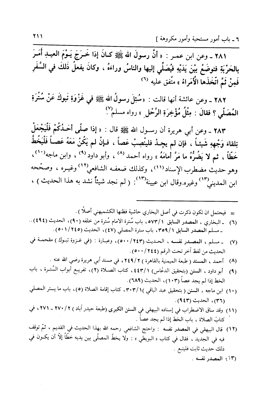283 - وَعَن أبي هُرَيْرَة أَن رَسُول الله صَلَّى اللَّهُ عَلَيْهِ وَسَلَّم َ قَالَ: " إِذا صَلَّى أحدكُم فليجعل تِلْقَاء وَجهه شَيْئا، فَإِن لم يجد فلينصب عَصا، فَإِن لم يكن مَعَه عَصا فليخط خطا، ثمَّ لَا يضرّهُ مَا مر أَمَامه " رَوَاهُ أَحْمد، وَأَبُو دَاوُد، وَابْن مَاجَه، (وَهُوَ حَدِيث مُضْطَرب الْإِسْنَاد، وَكَذَلِكَ ضعفه الشَّافِعِي وَغَيره، وَصَححهُ ابْن الْمَدِينِيّ وَغَيره. وَقَالَ ابْن عُيَيْنَة: (لم نجد شَيْئا نَشد بِهِ هَذَا الحَدِيث)) ،