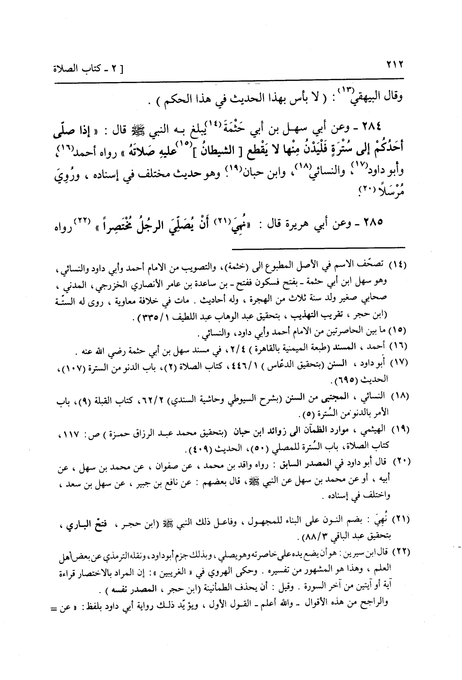 284 - وَعَن أبي سهل بن أبي حثْمَة يبلغ بِهِ النَّبِي صَلَّى اللَّهُ عَلَيْهِ وَسَلَّم َ قَالَ: " إِذا صَلَّى أحدكُم إِلَى ستْرَة فليدن مِنْهَا لَا يقطع [الشَّيْطَان] عَلَيْهِ صلَاته " رَوَاهُ أَحْمد، وَأَبُو دَاوُد، وَالنَّسَائِيّ، وَابْن حبَان. (وَهُوَ حَدِيث مُخْتَلف فِي إِسْنَاده، وَرُوِيَ مُرْسلا.
