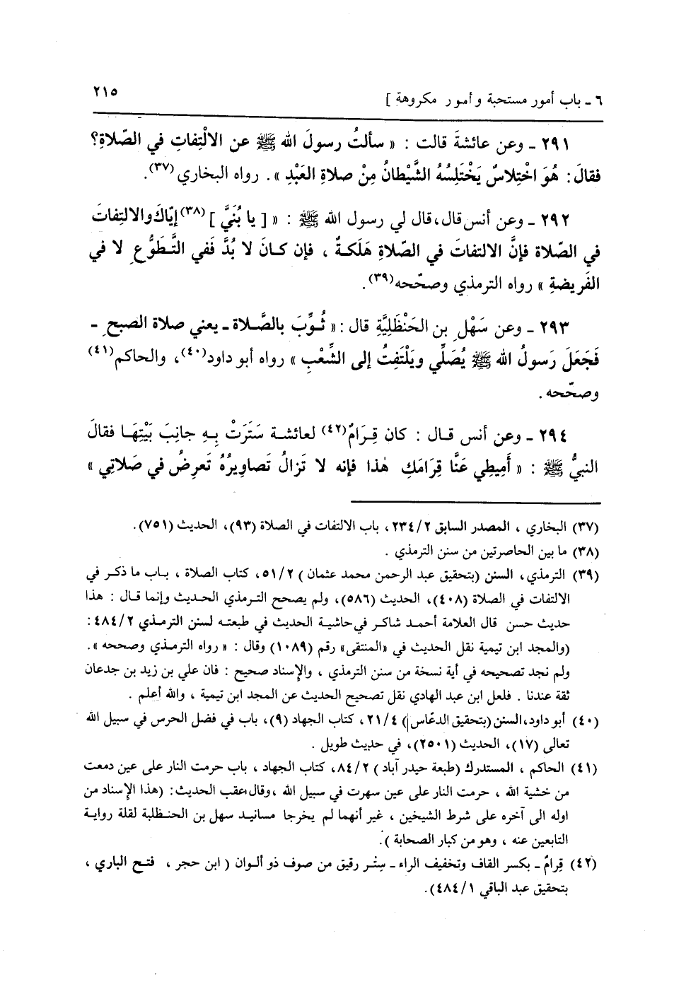 292 - وَعَن أنس قَالَ، قَالَ لي رَسُول الله صَلَّى اللَّهُ عَلَيْهِ وَسَلَّم َ: " [يَا بني] إياك والالتفات فِي الصَّلَاة فَإِن الِالْتِفَات فِي الصَّلَاة هلكة، فَإِن كَانَ لَا بُد فَفِي التَّطَوُّع لَا فِي الْفَرِيضَة " رَوَاهُ التِّرْمِذِيّ وَصَححهُ.