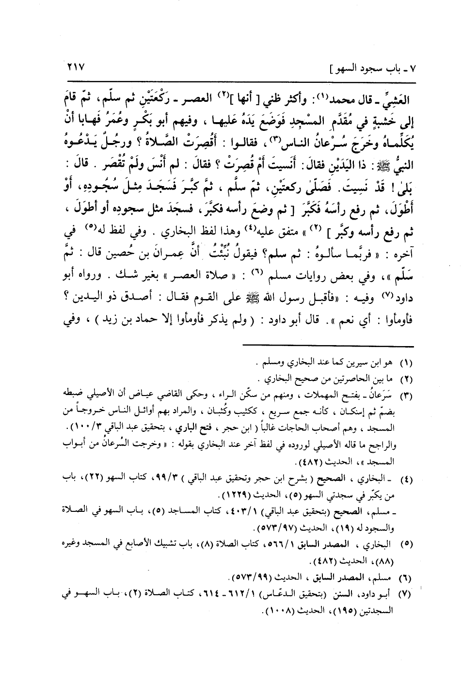 الْعشي - قَالَ مُحَمَّد: وَأكْثر ظَنِّي [أَنَّهَا] الْعَصْر - رَكْعَتَيْنِ ثمَّ سلم، ثمَّ قَامَ إِلَى خَشَبَة فِي مقدم الْمَسْجِد فَوضع يَده عَلَيْهَا، وَفِيهِمْ أَبُو بكر وَعمر فَهَابَا أَن يُكَلِّمَاهُ وَخرج سرعَان النَّاس، فَقَالُوا: أقصرت الصَّلَاة؟ وَرجل يَدعُوهُ النَّبِي صَلَّى اللَّهُ عَلَيْهِ وَسَلَّم َ: ذَا الْيَدَيْنِ فَقَالَ: أنسيت أم قصرت؟ فَقَالَ: لم أنس وَلم تقصر. قَالَ: بلَى! قد نسيت. فَصَلى رَكْعَتَيْنِ، ثمَّ سلم، ثمَّ كبّر فَسجدَ مثل سُجُوده، أَو أطول، ثمَّ رفع رَأسه فكبّر [ثمَّ وضع رَأسه فكبّر، فَسجدَ مثل سُجُوده أَو أطول، ثمَّ رفع رَأسه وكبّر] " مُتَّفق عَلَيْهِ وَهَذَا لفظ البُخَارِيّ. وَفِي لفظ لَهُ فِي آخِره: " فَرُبمَا سَأَلُوهُ: ثمَّ سلم؟ فَيَقُول نبئت أَن عمرَان بن حُصَيْن قَالَ: ثمَّ سلم "، وَفِي بعض رِوَايَات مُسلم: " صَلَاة الْعَصْر " بِغَيْر شكّ. وَرَوَاهُ أَبُو دَاوُد وَفِيه: " فَأقبل رَسُول الله صَلَّى اللَّهُ عَلَيْهِ وَسَلَّم َ عَلَى الْقَوْم فَقَالَ: أصدق ذُو الْيَدَيْنِ؟ فأومأوا: أَي نعم ". قَالَ أَبُو دَاوُد: (وَلم يذكر فأومأوا إِلَّا حَمَّاد بن زيد) ، وَفِي